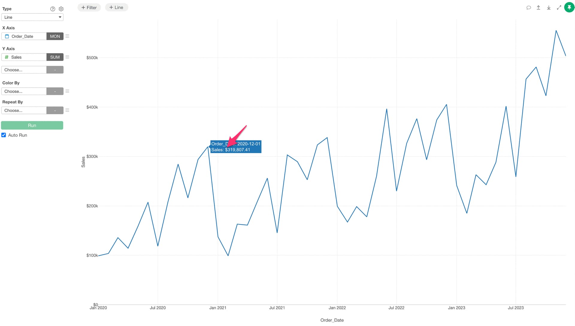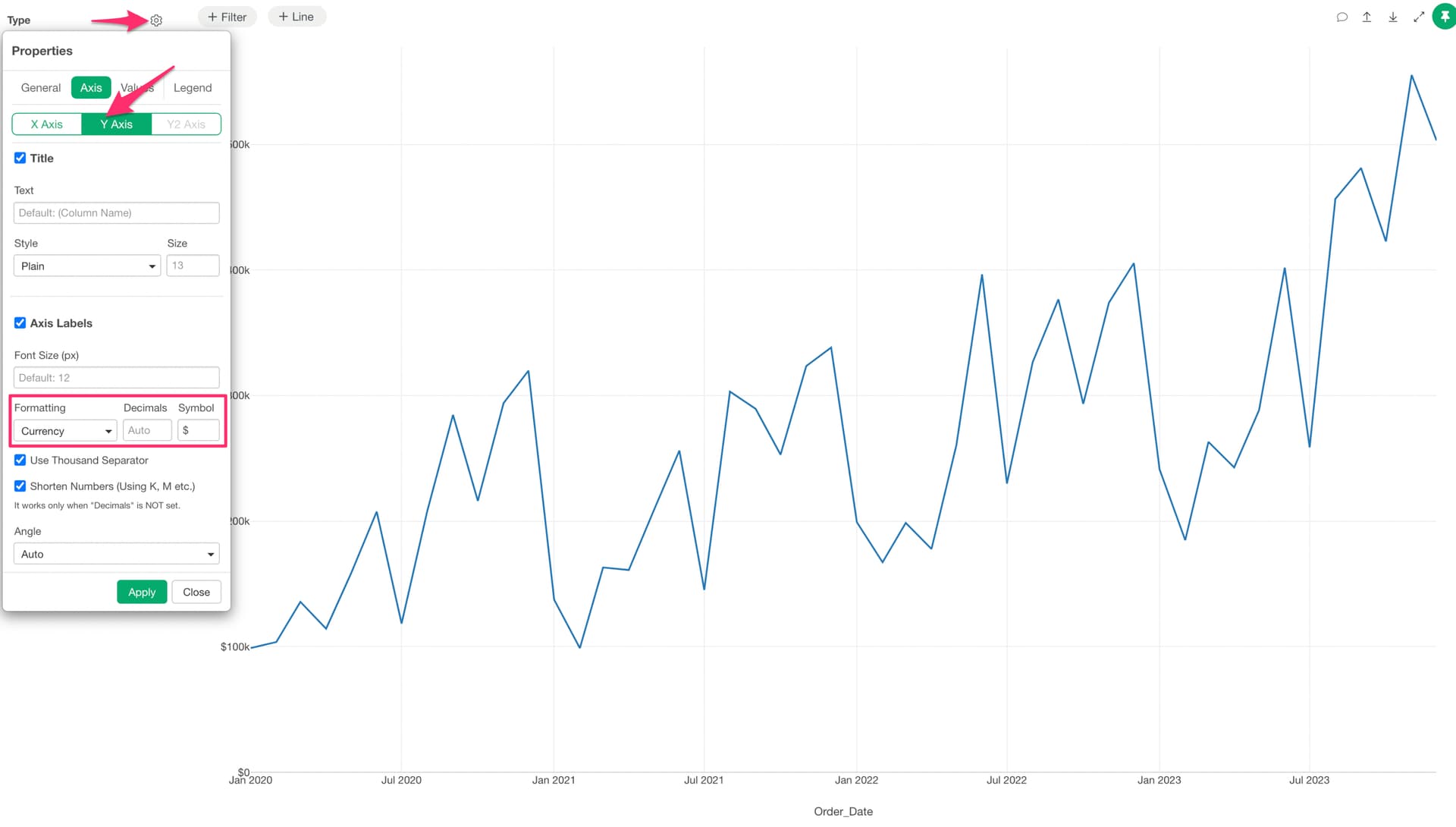 When you want to add currency symbols to the Y-axis in charts with X and Y axes, such as bar or line charts, you can do so by selecting “Currency” in the Format option from the Y-axis settings.