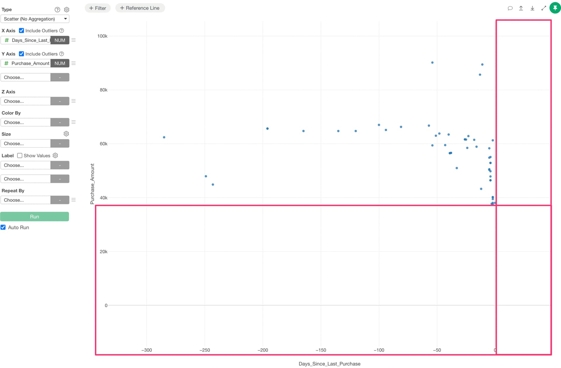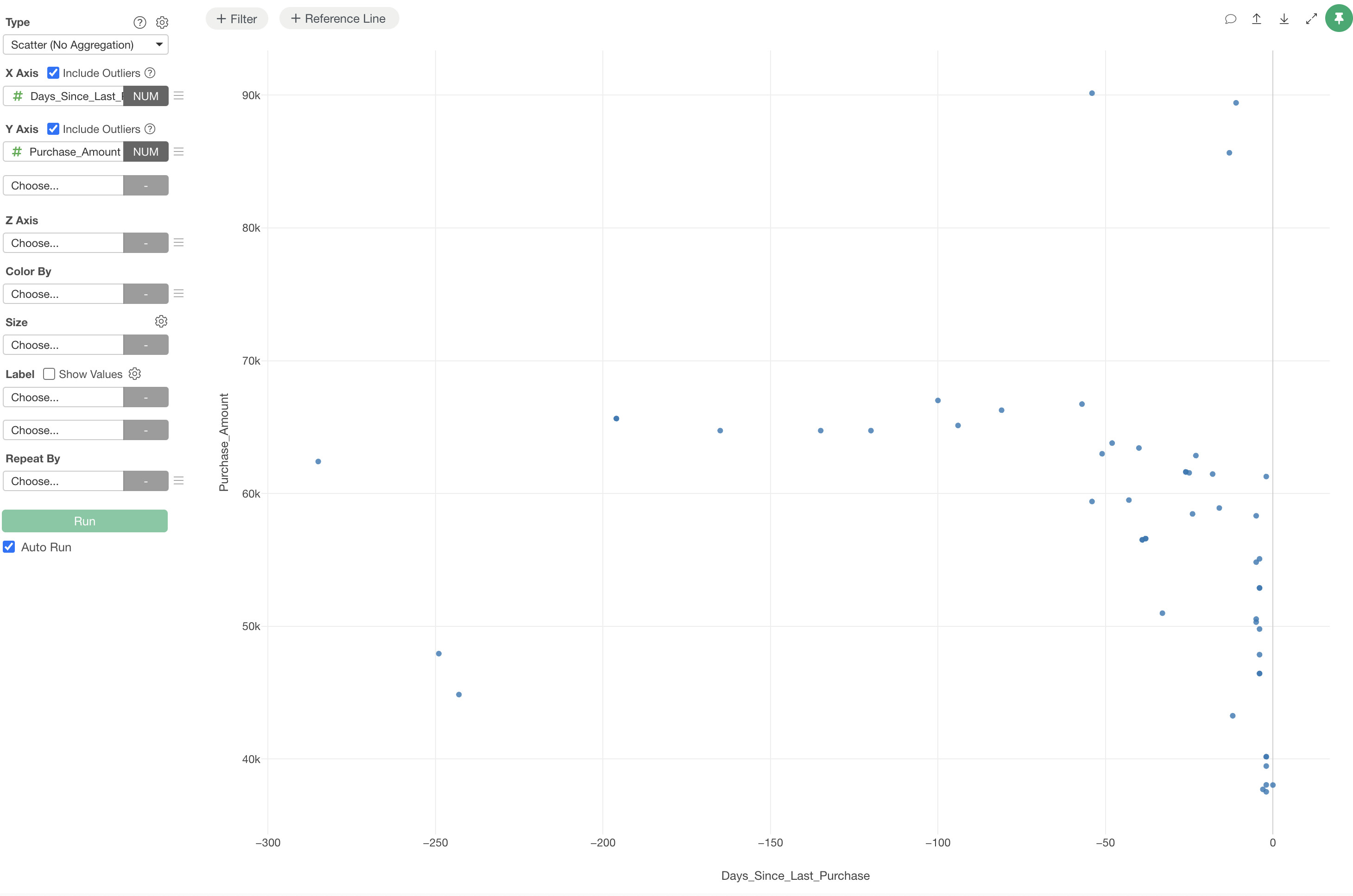 When visualizing data with a scatter plot, you may encounter situations where excessive whitespace appears as shown below. This can be adjusted through the settings.
