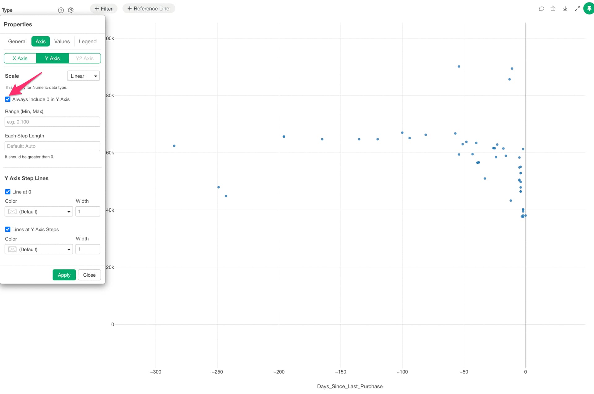 By unchecking the “Include 0 in X-axis (Y-axis)” setting, the scatter plot display will adjust to fit the area where data points are shown.