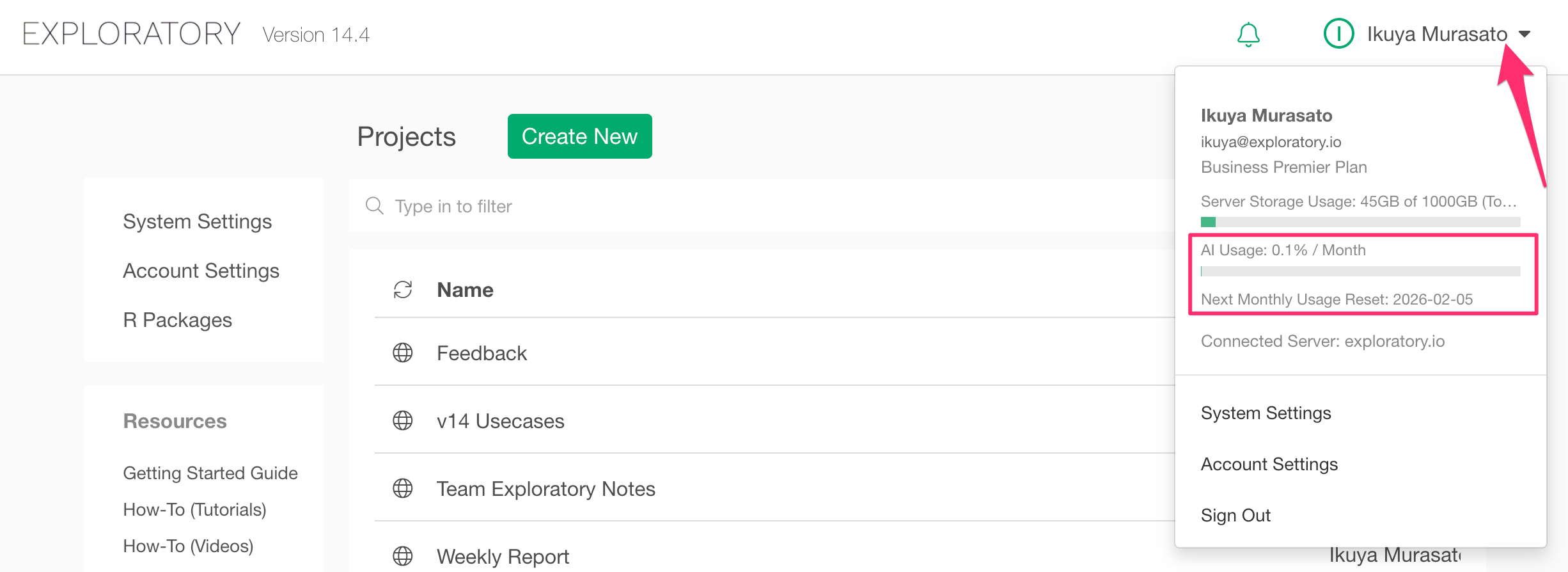 Currently, usage is displayed as a percentage (%) on the Exploratory Desktop and Server screens, but it is actually calculated based on the following "Monthly Credit System."