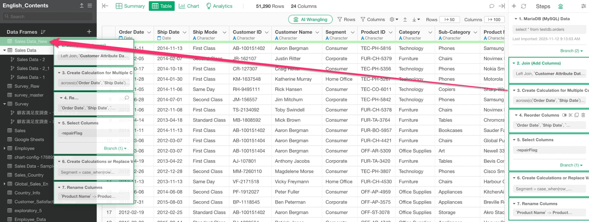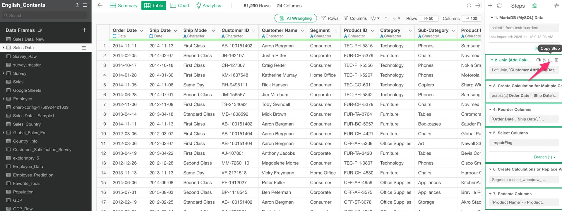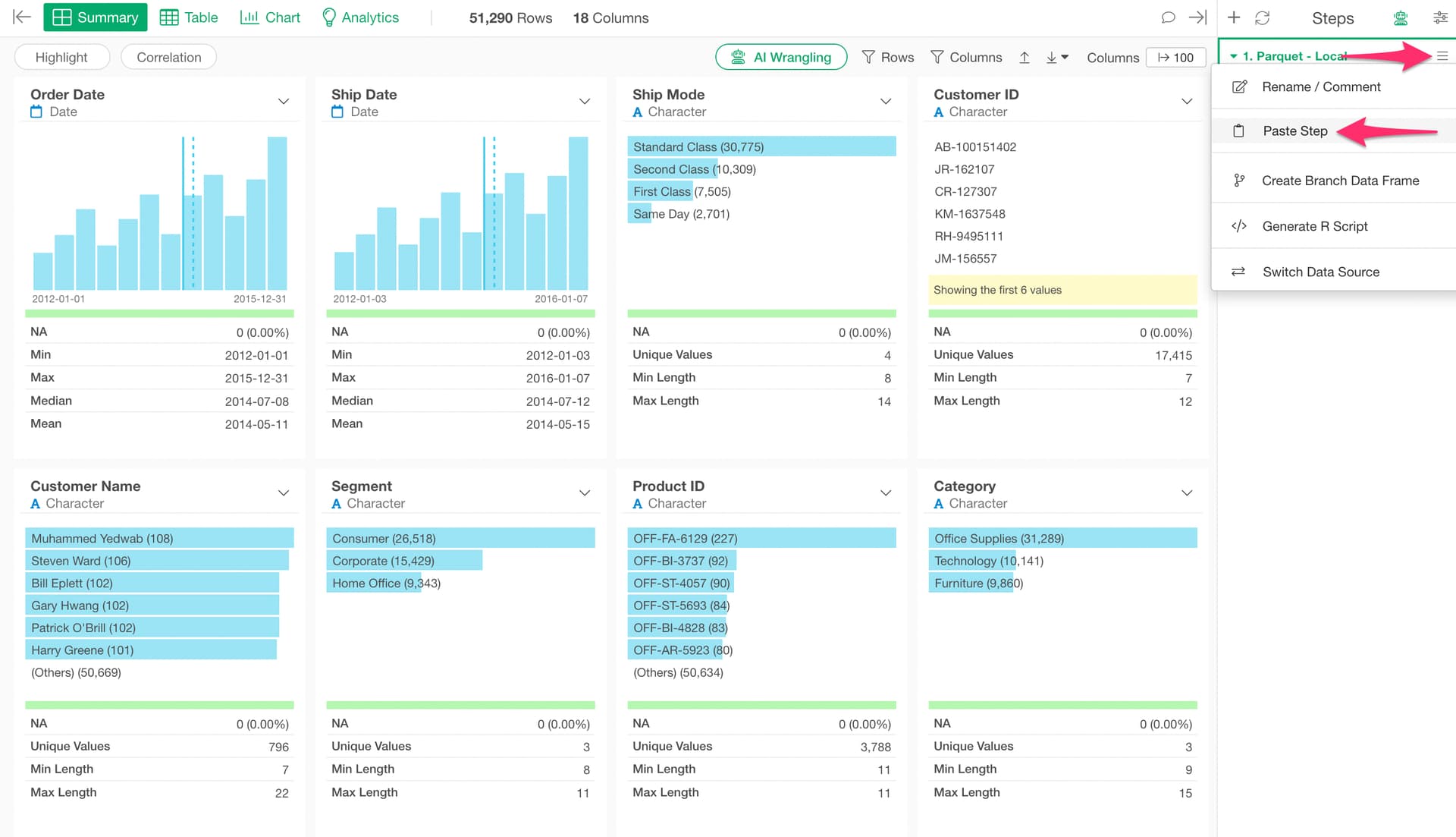 If you copied the steps from the step menu, paste them by selecting “Paste” from the step menu in the target data frame.
