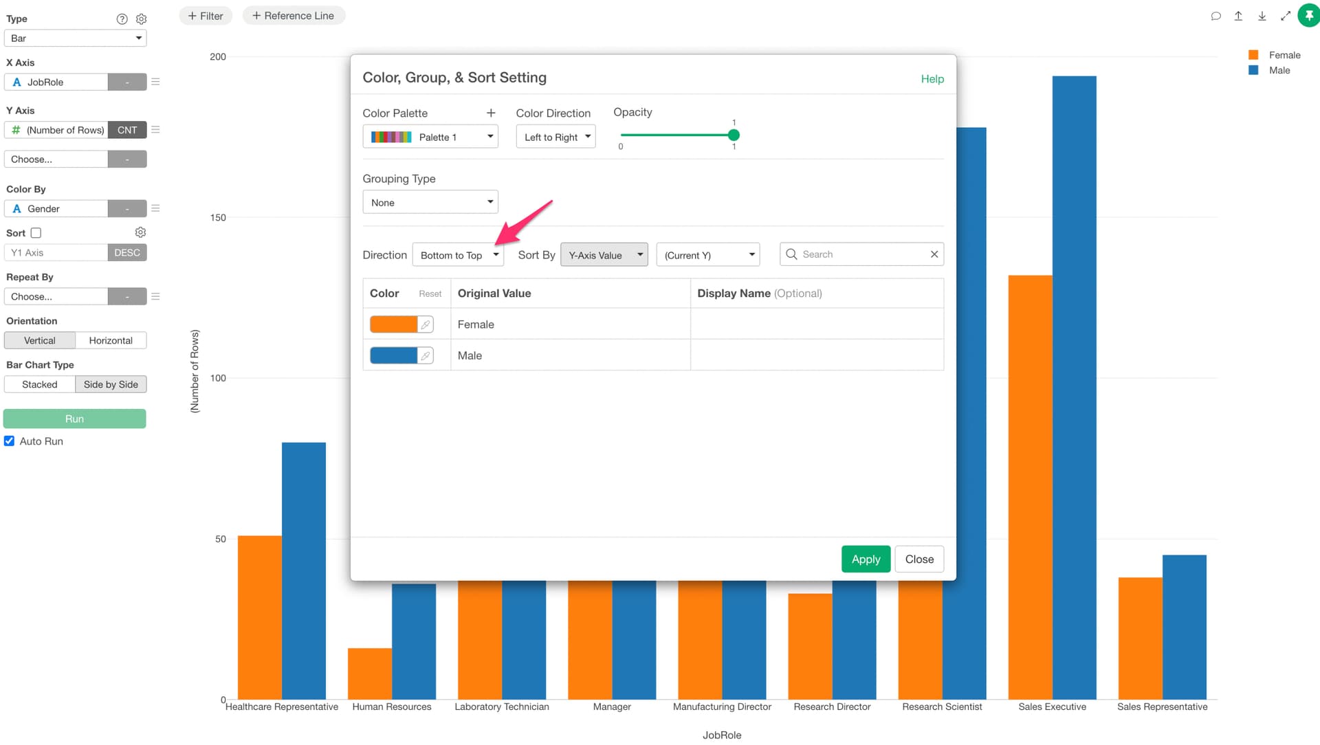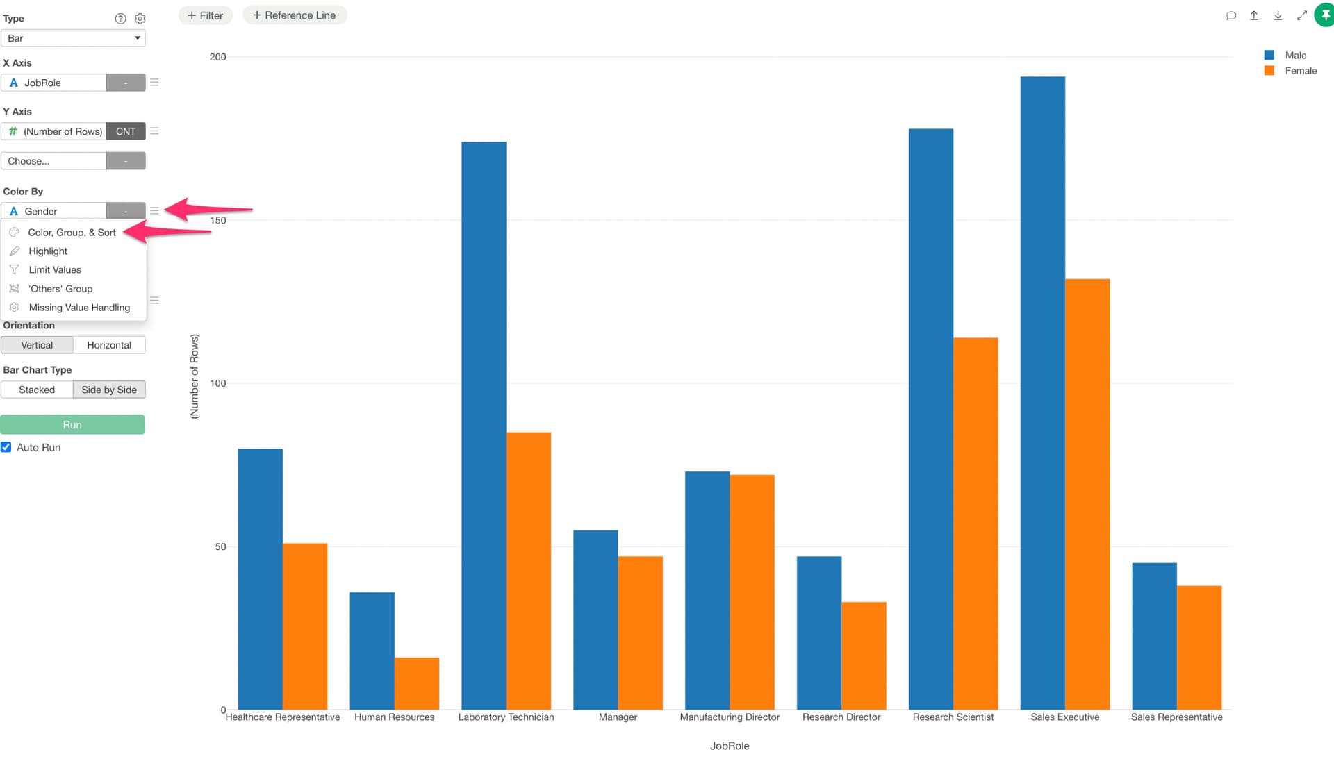 For example, suppose you have a bar chart with a “Gender” column assigned to color, and the values are displayed in the order “Male”, “Female”, but you want to change it to “Female”, “Male”.