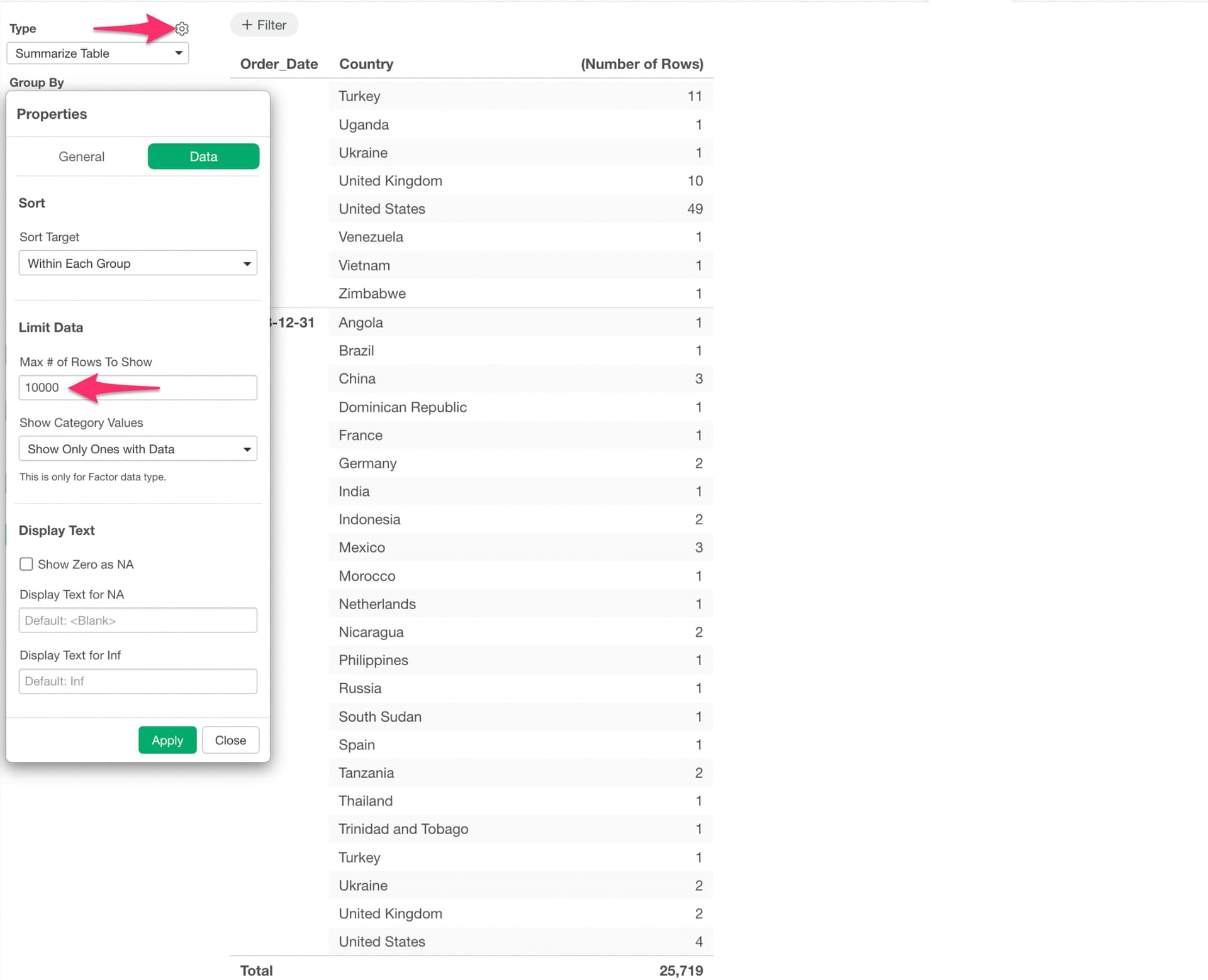 If you see text like “Showing rows” at the top of the table, subsequent rows are abbreviated for performance reasons and displayed in the “…” format.