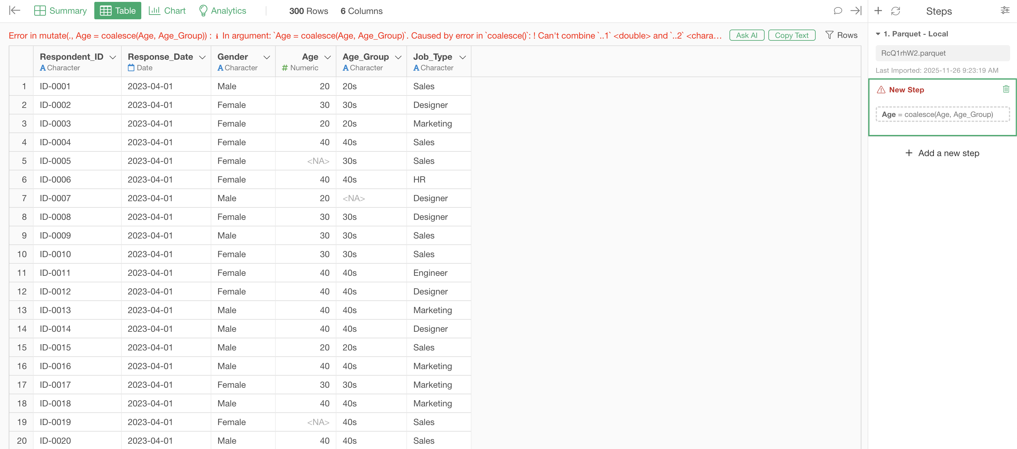 Error in mutate(., Age = coalesce(Age, Age_Group)) :