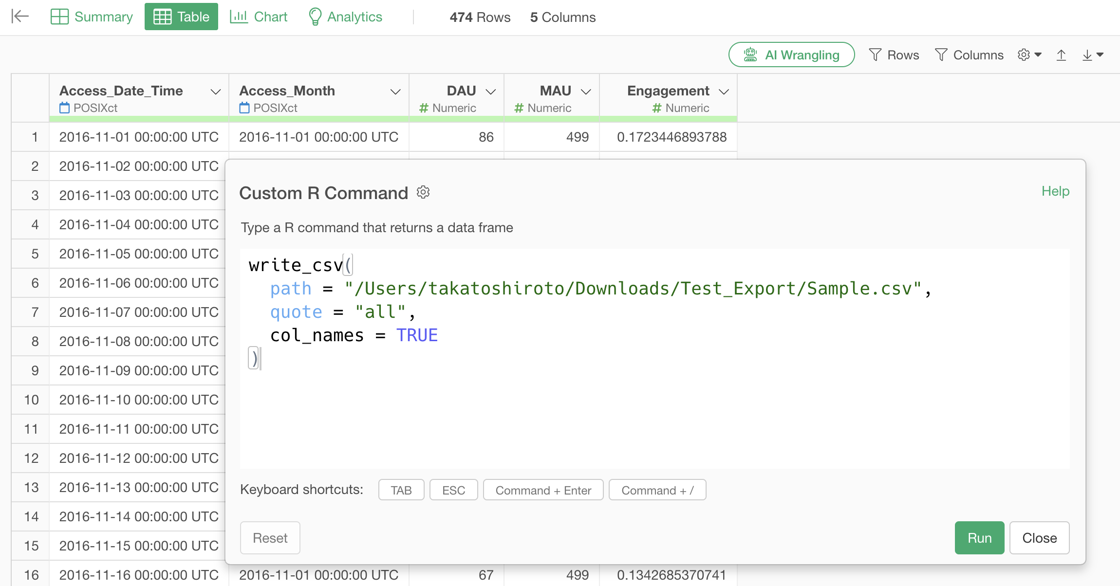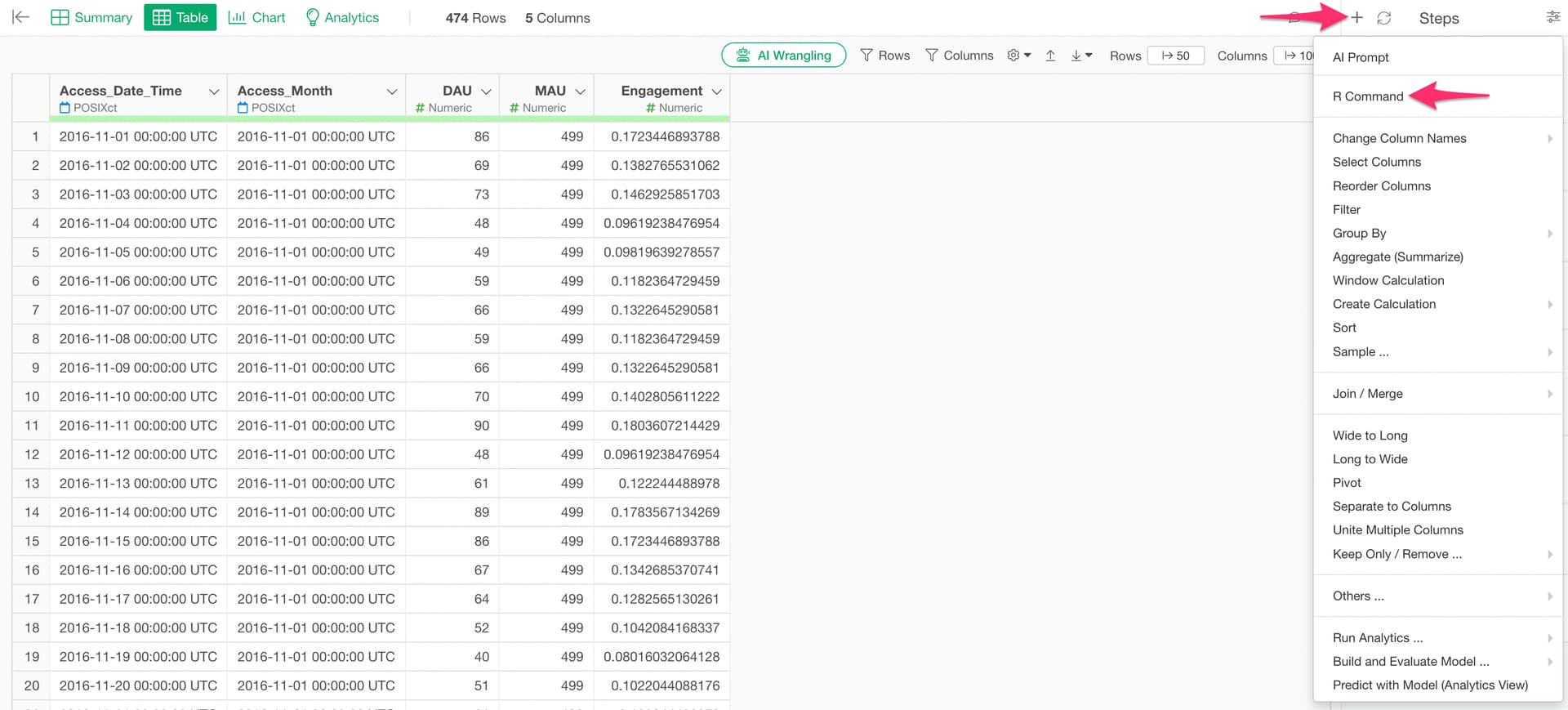 When you want to constantly export your data to a specific folder as a CSV file based on steps processed in Exploratory, there are times when you want to create an export operation as a step. In that case, select “R Command” from the plus button of the step.