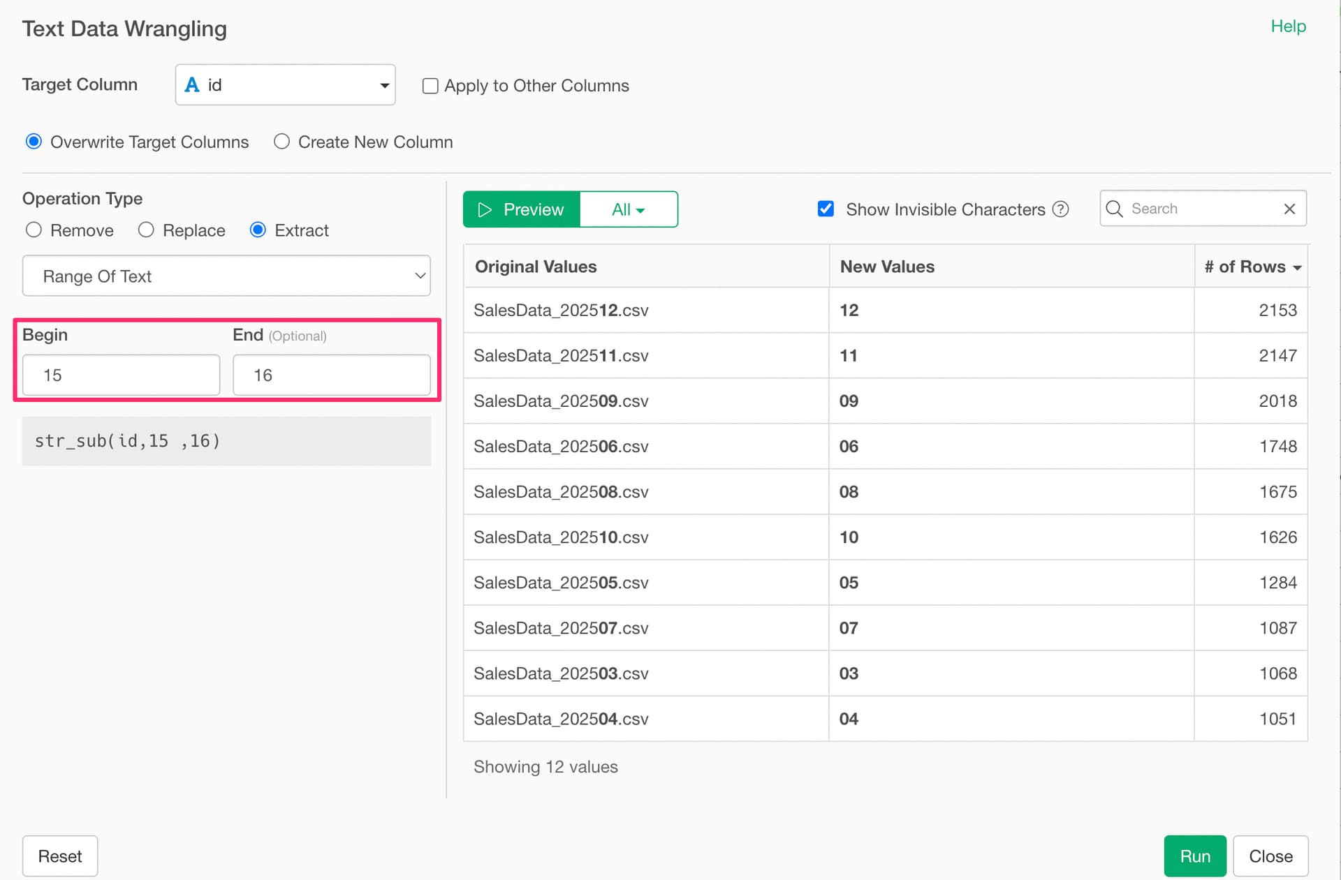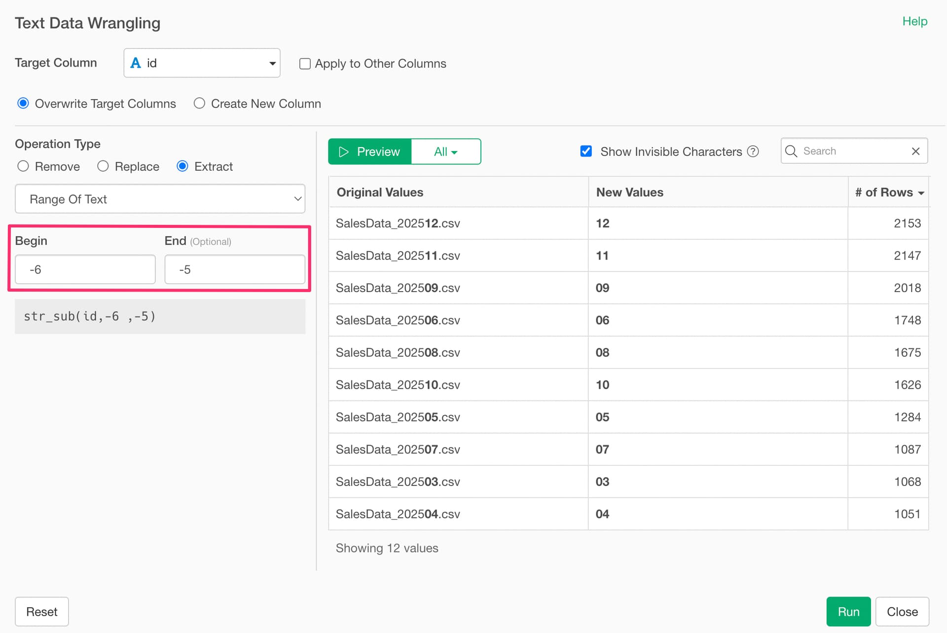 When you import multiple CSV files, an “id” column is added. If you want to extract specific characters from a designated range, such as the “month” portion, you can do so.