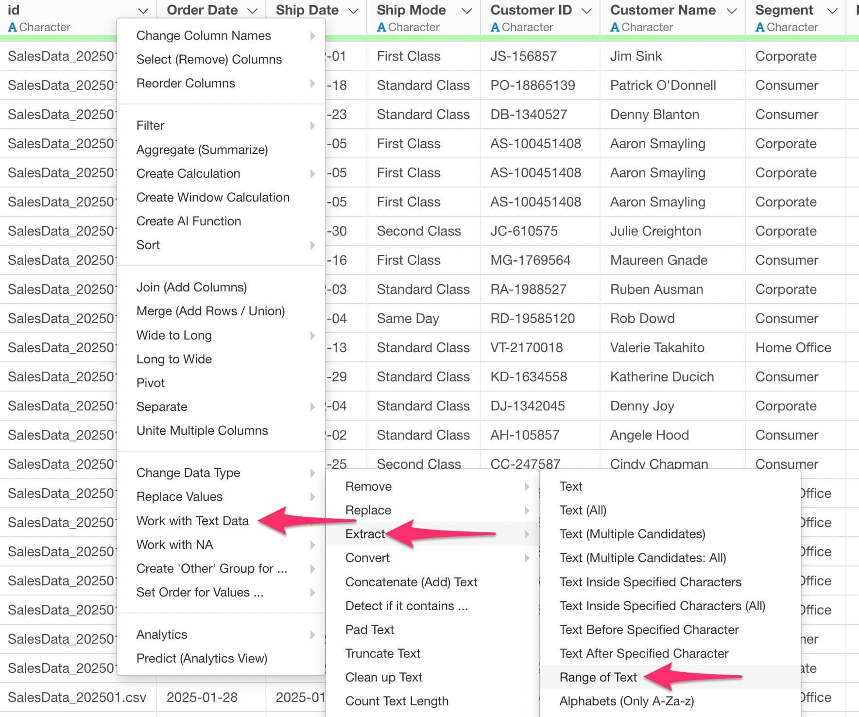 In this case, select “Extract” under “Work with Text Data” and then choose “Range of Text”