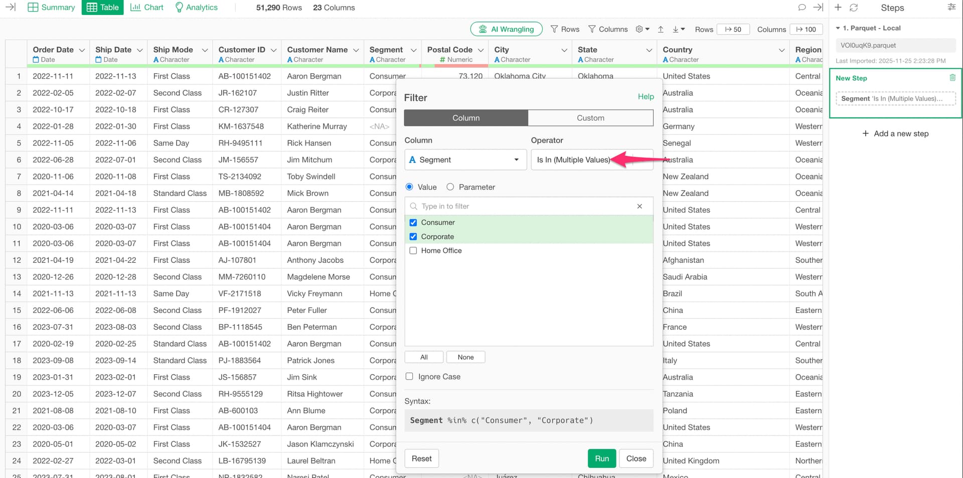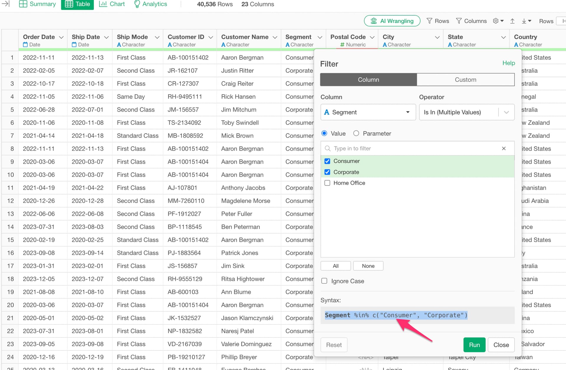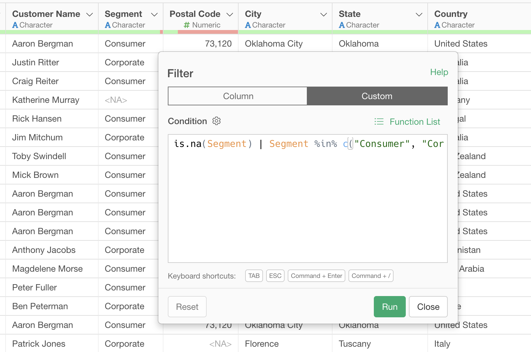 The is.na function determines whether a value is missing. Also, “|” represents an OR condition, so it will narrow down to values where either the value is missing or the Customer Segment is Consumer or Corporate.