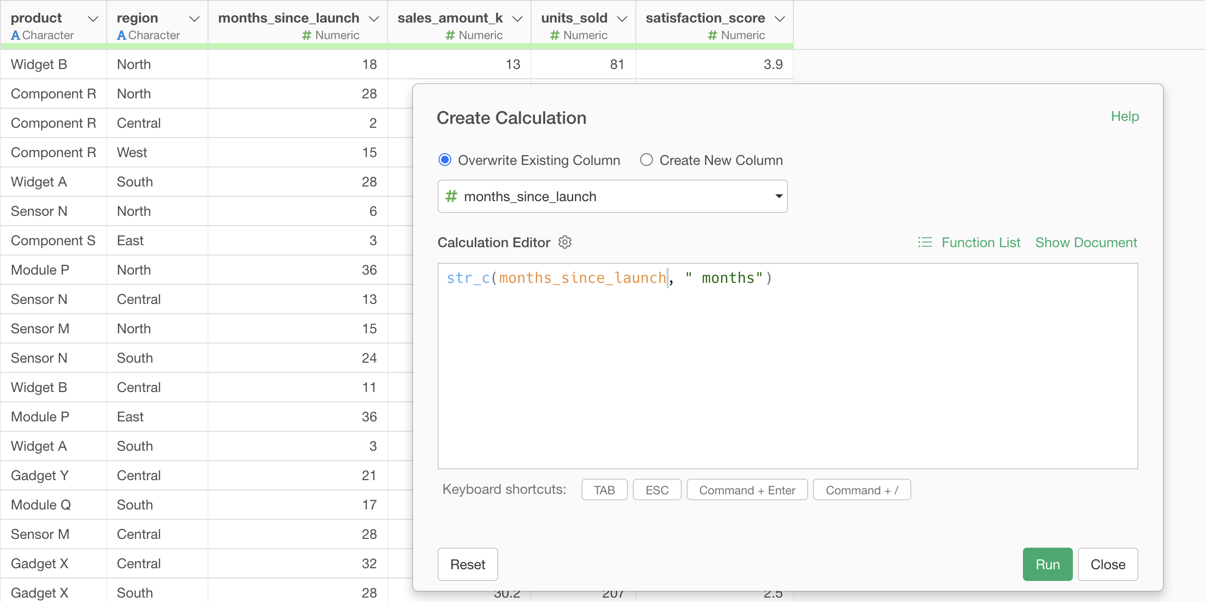 In the dialog, use the str_c function as follows. For example, if you have a numeric column called months and want to create values like “12 months”, you can write: