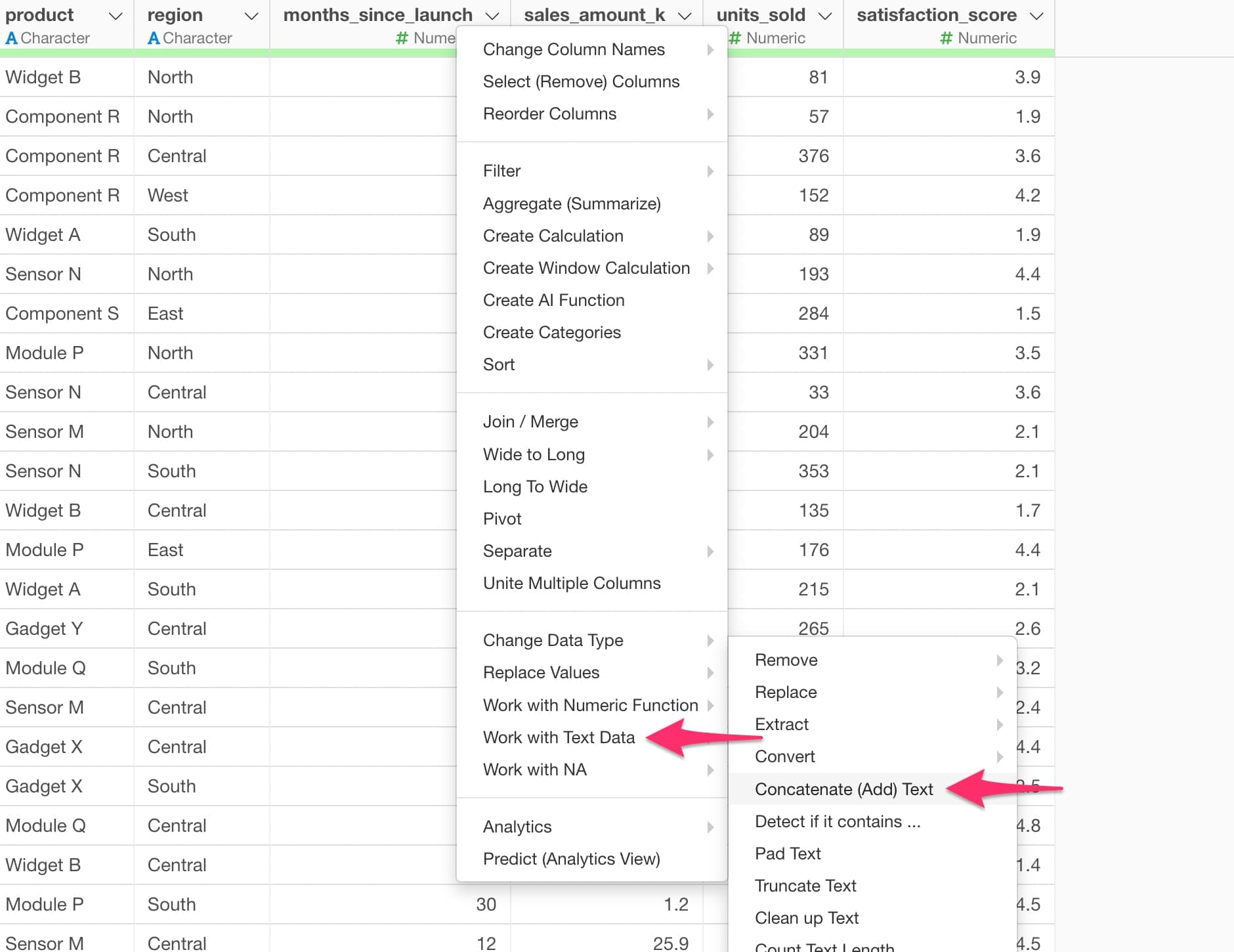 Select the column header menu, then go to “Work with Text Data” → “Concatenate (Add) Text”.