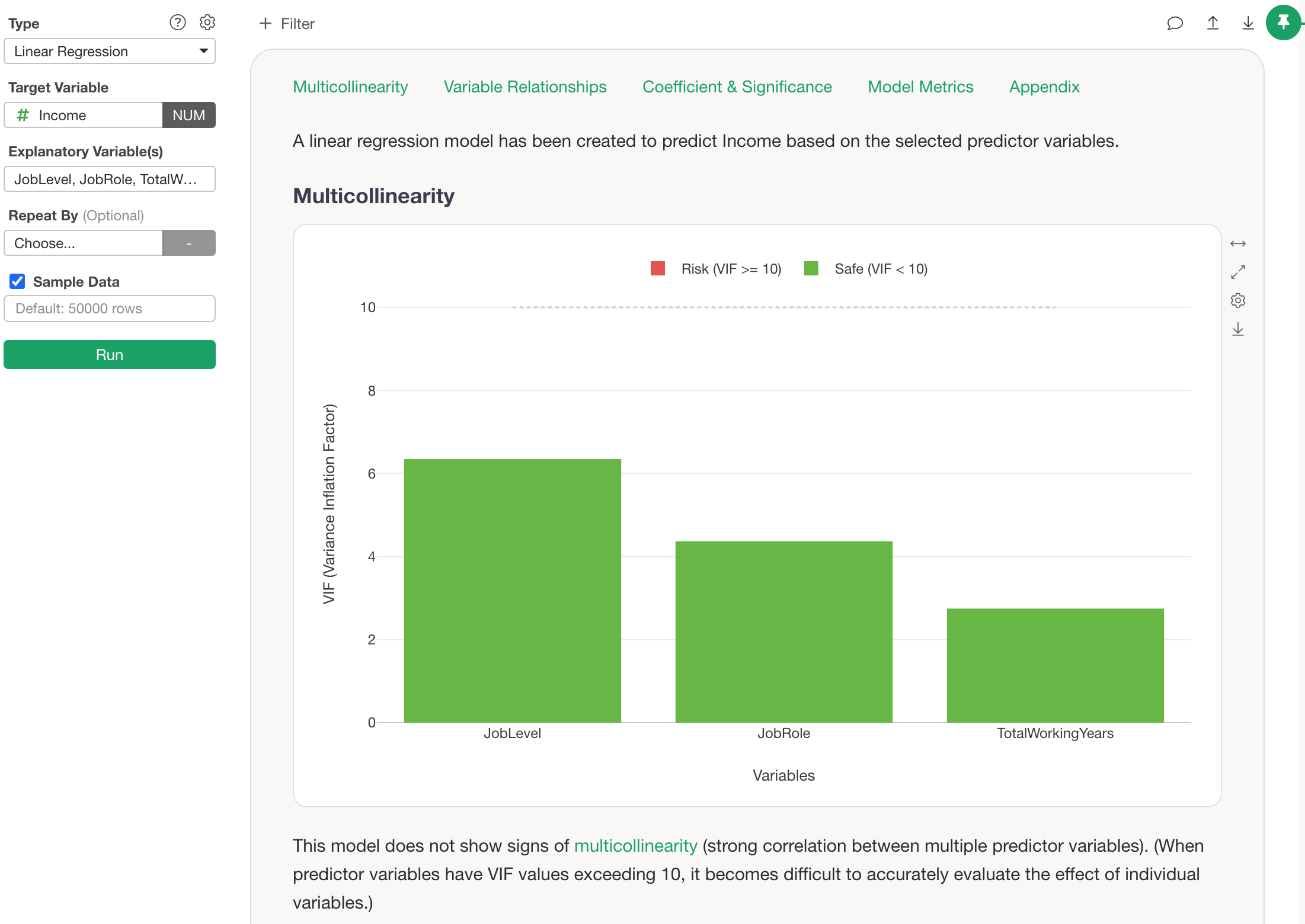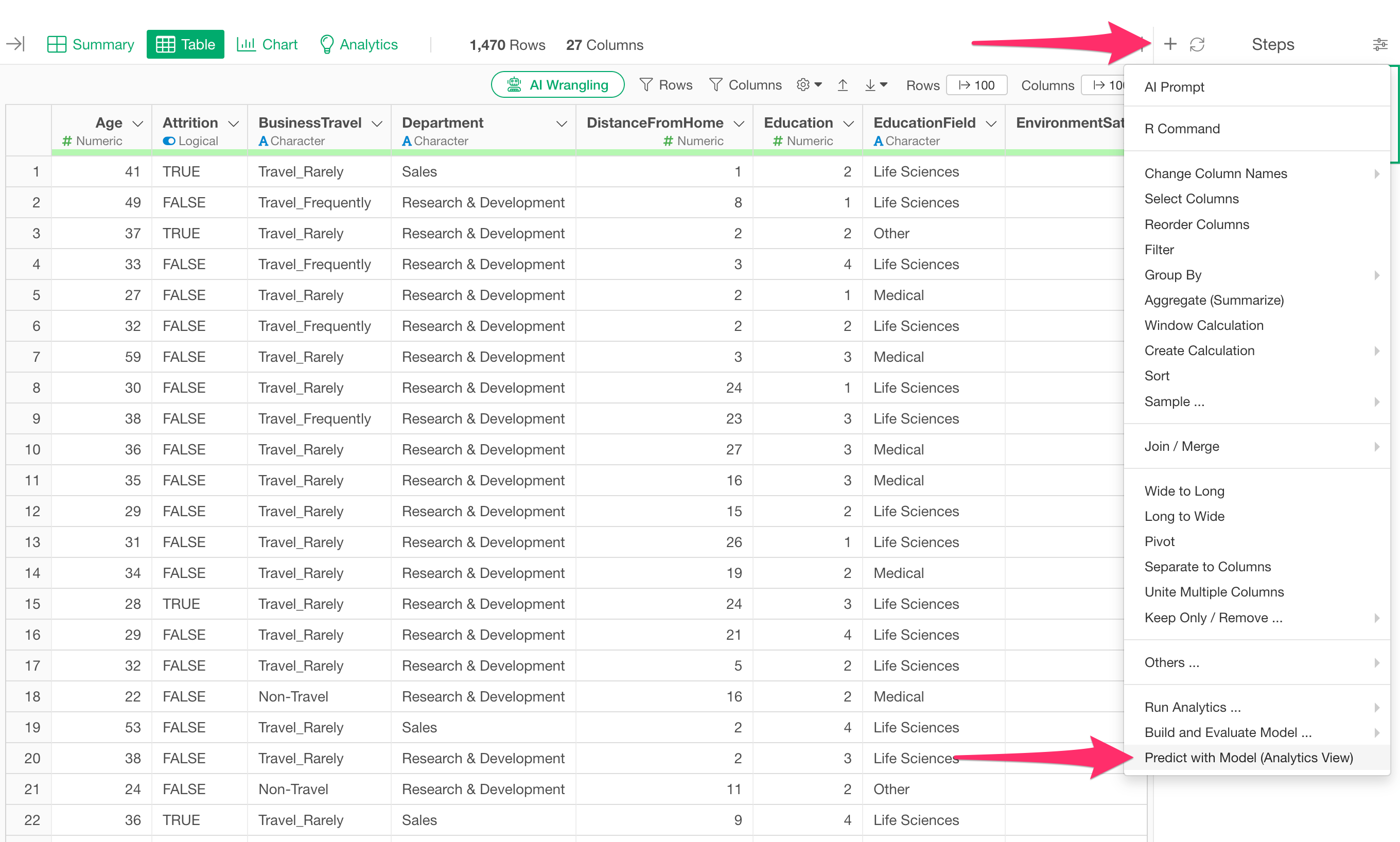 In Exploratory, you can generate numeric or logical predictions using statistical or machine learning models in the Analytics View.