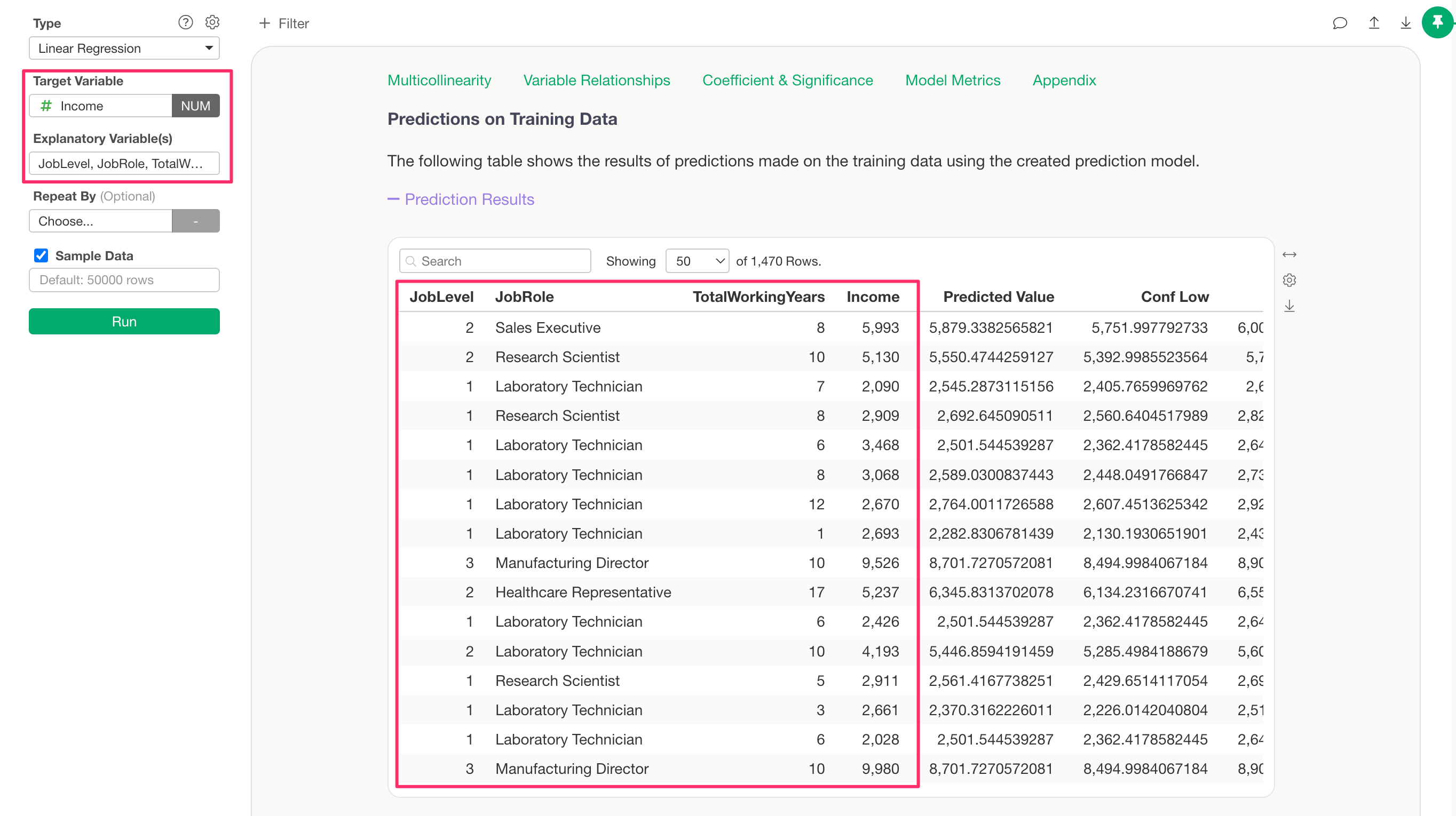 Additionally, in the “Predictions for Training Data” section of a completed analysis, you can review the original data along with prediction values.