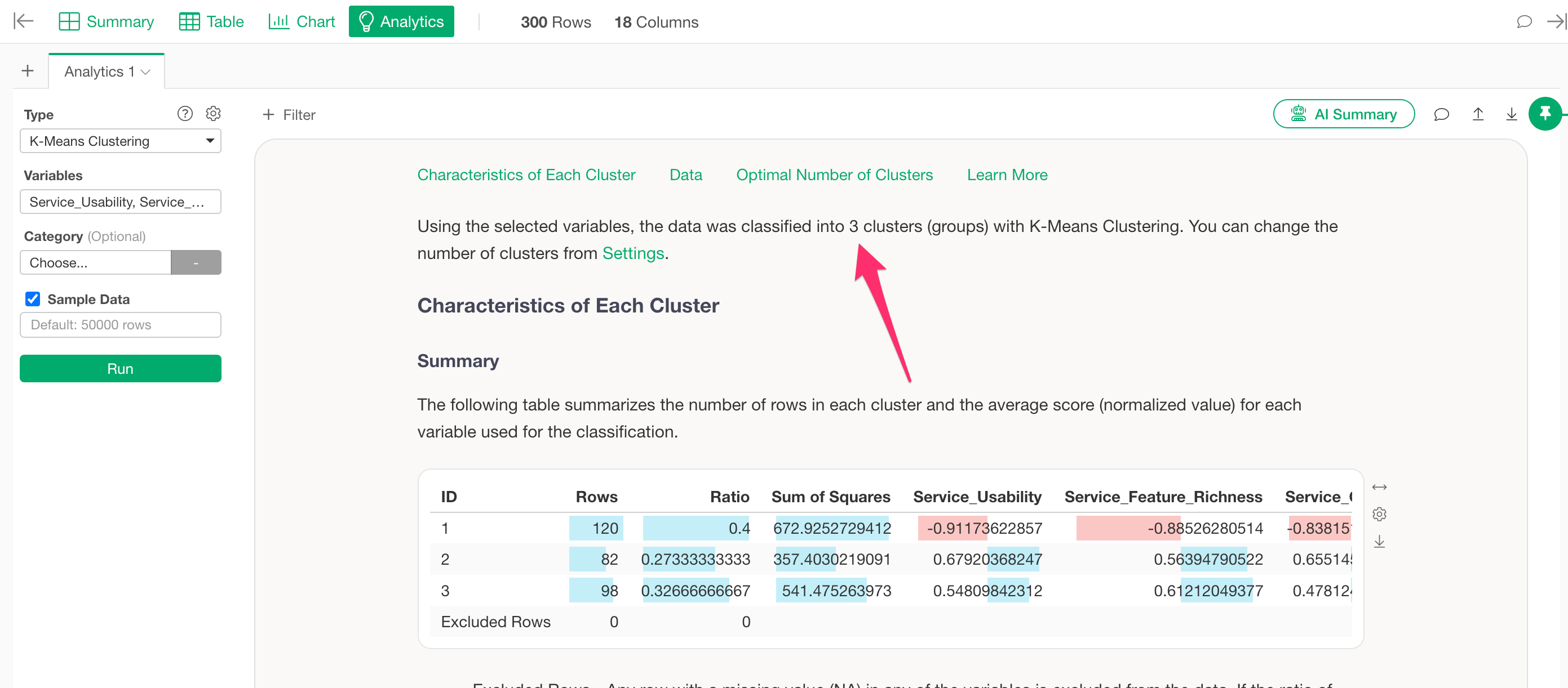 When running K-Means clustering in Exploratory, the data is divided into three clusters by default.