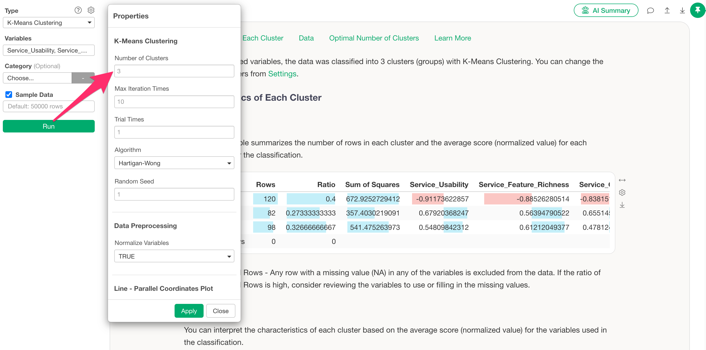 In the settings dialog, you’ll find a menu to set the number of clusters, where you can adjust the number as needed.