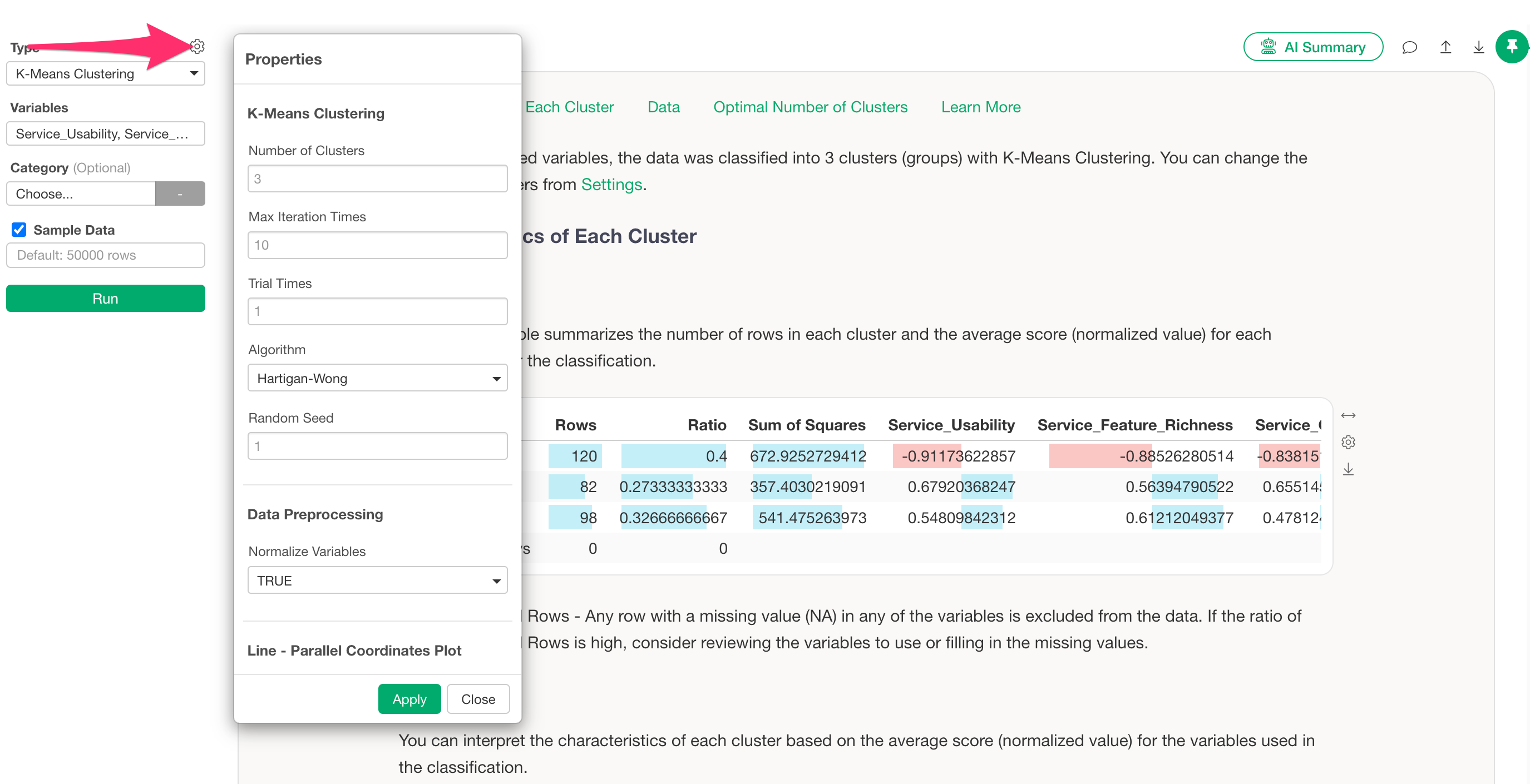 If you want to change the number of clusters, click the gear icon to open the settings dialog.