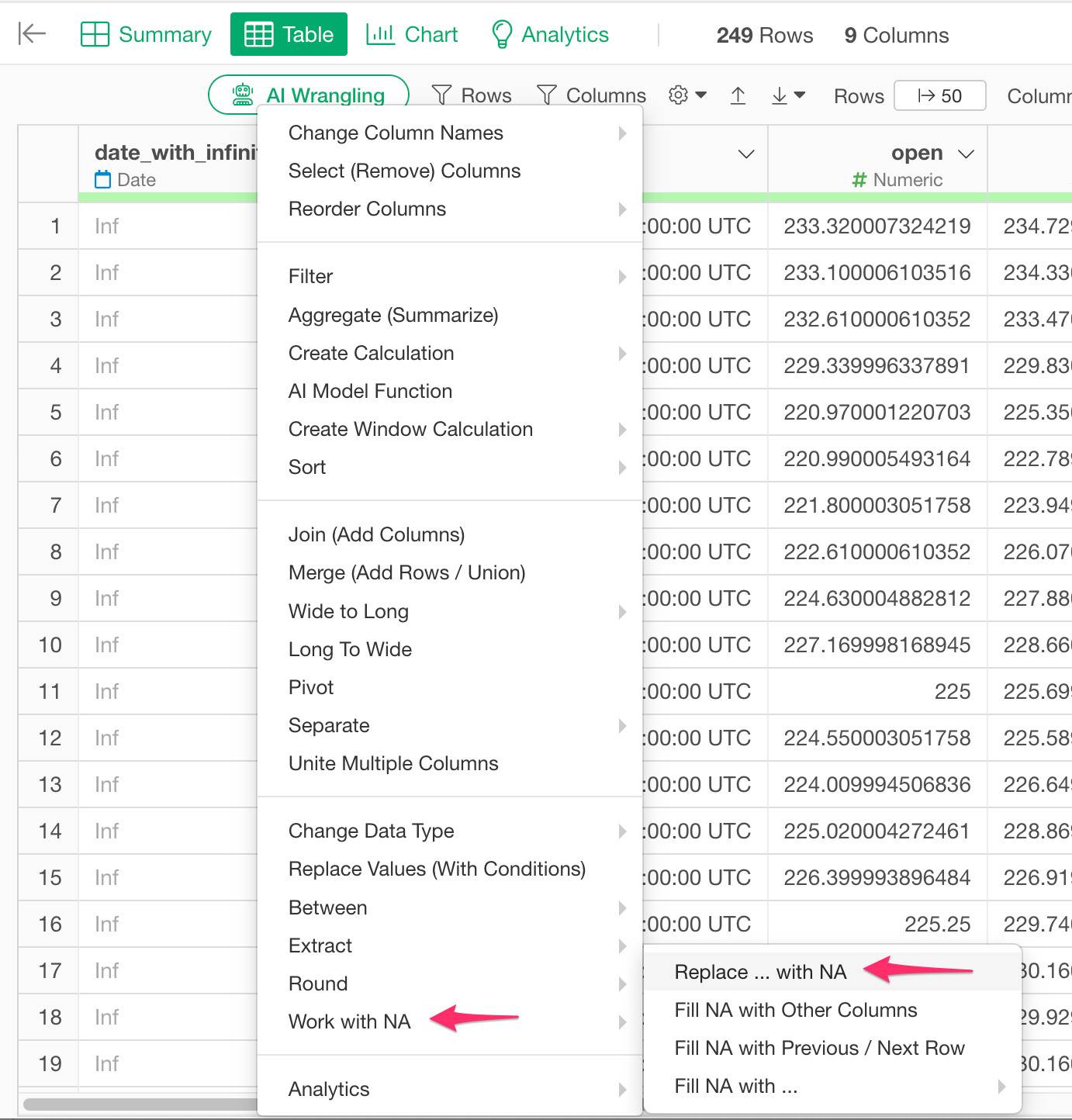 - Select the target column, and from the column header menu, choose “Missing Value (NA) Processing” → “Replace … with Missing Value (NA)”