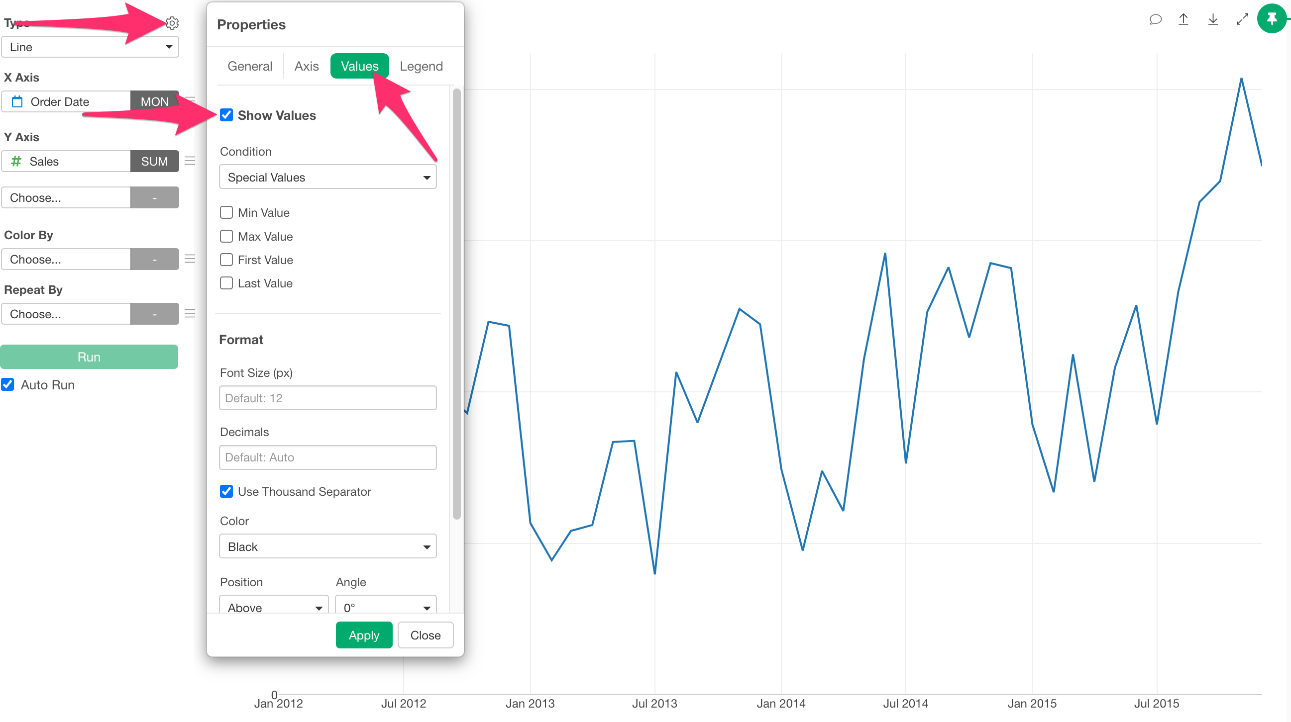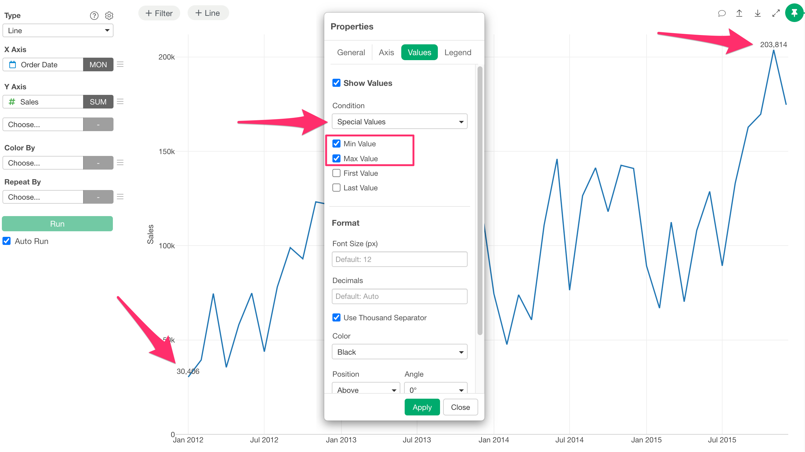 Next, under “Condition,” select “Special Values,” then choose “Min Value” and “Max Value,” and click the Apply button. This will display the minimum and maximum value information on the chart.