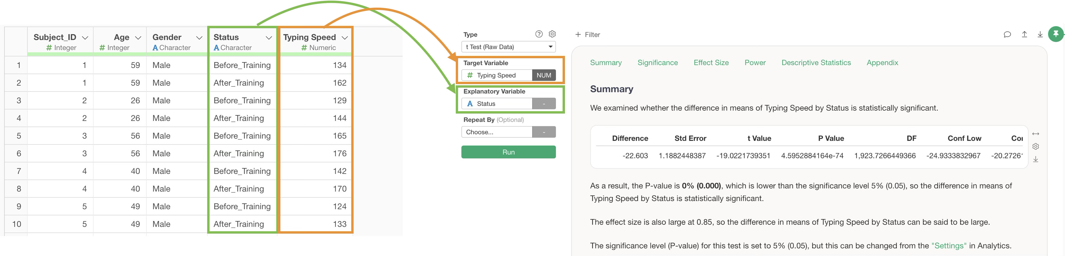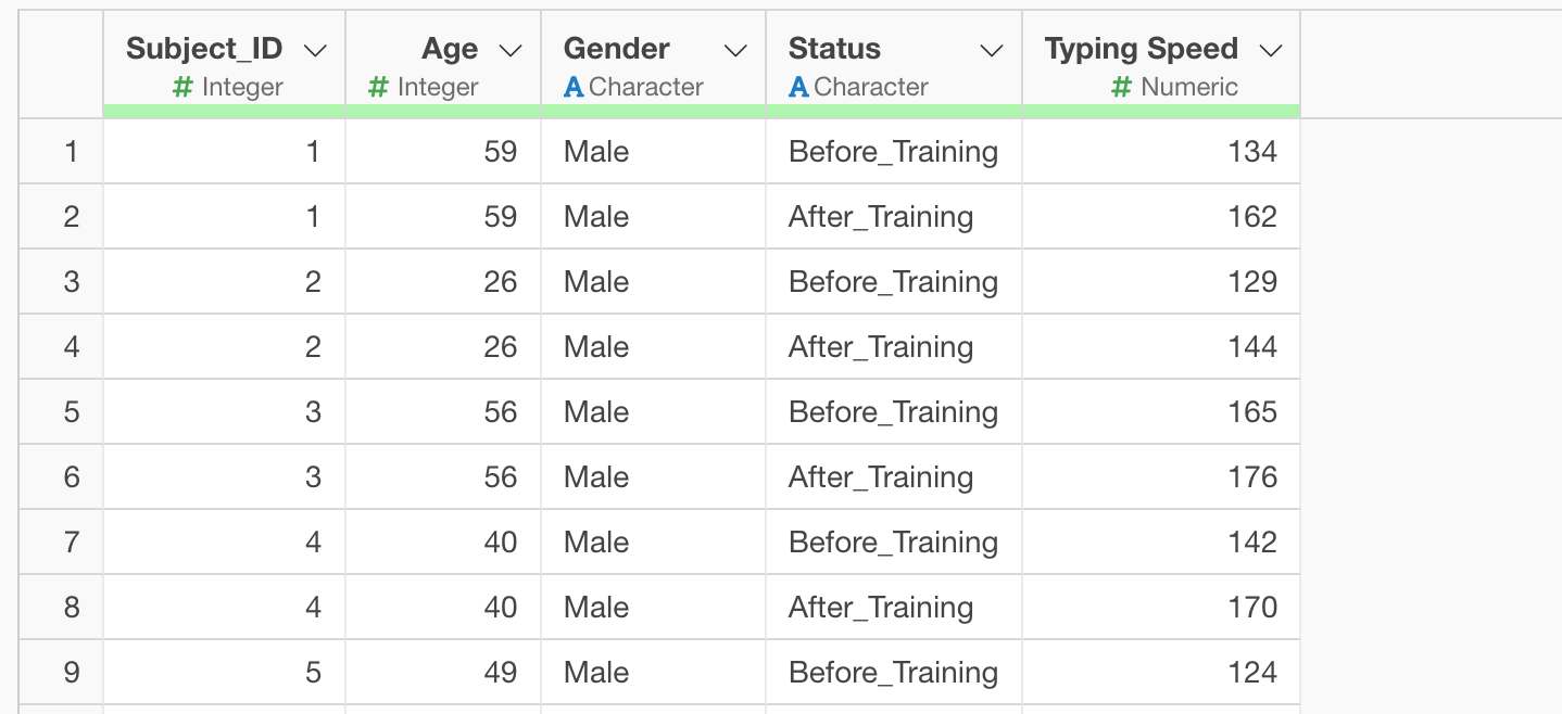 For example, in the case above, each row represents one person’s typing speed measurement, and the “Status” column indicates whether it was measured “Before” or “After” training.