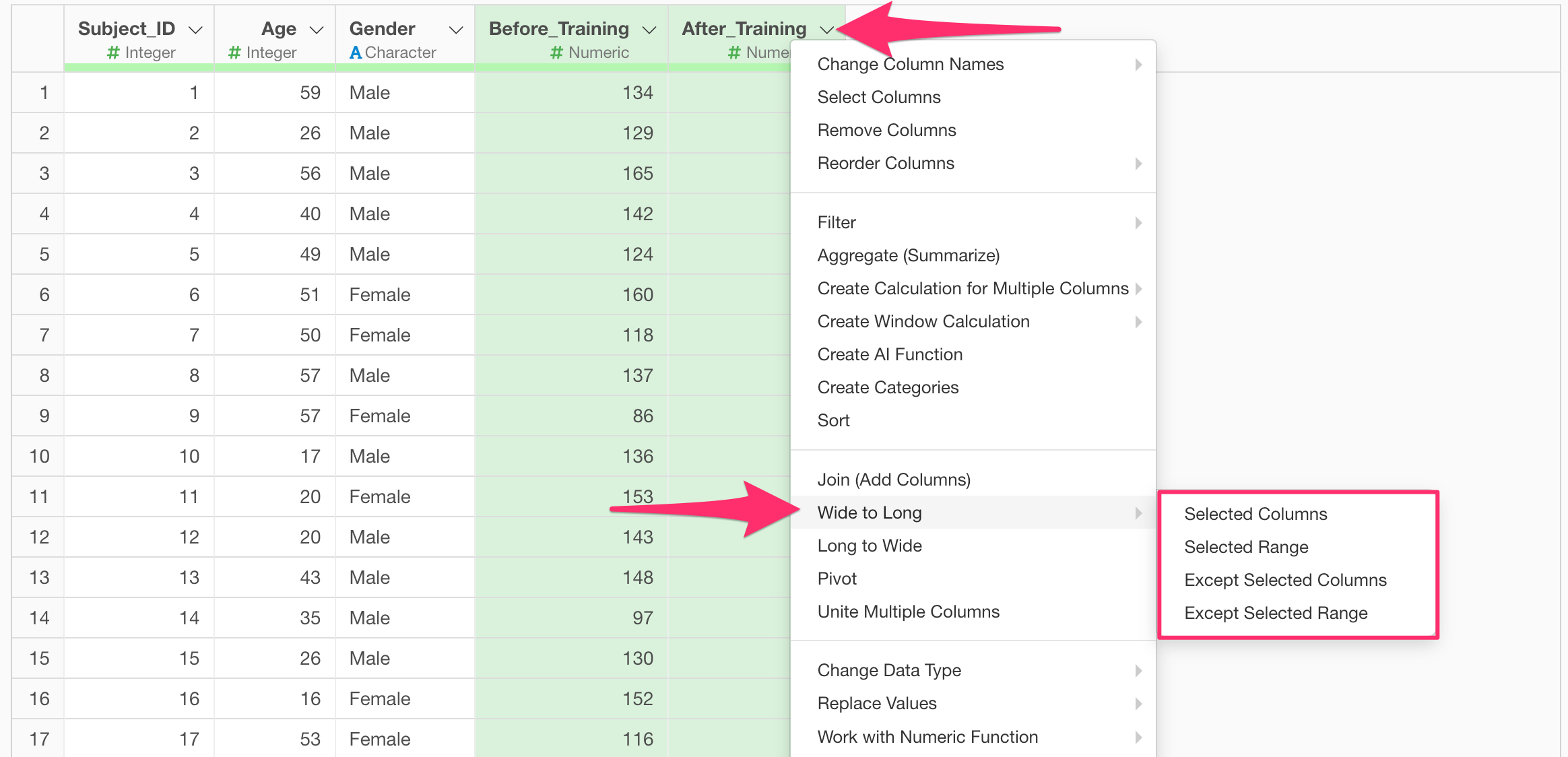 Specifically, you can select the measurement columns and use the column header menu to transform the data from wide format to long format. This makes the data suitable for a t-test. (For more on long-format conversion, please refer to this guide.)