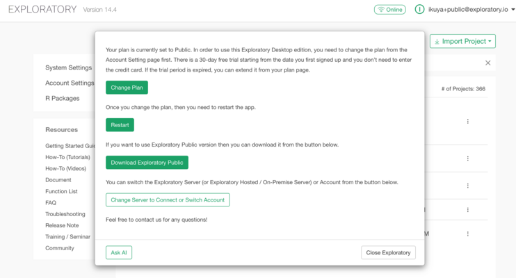 “Your plan is currently set to Public. In order to use this Exploratory Desktop edition, you need to change the plan from the Account Setting page first.”