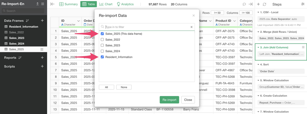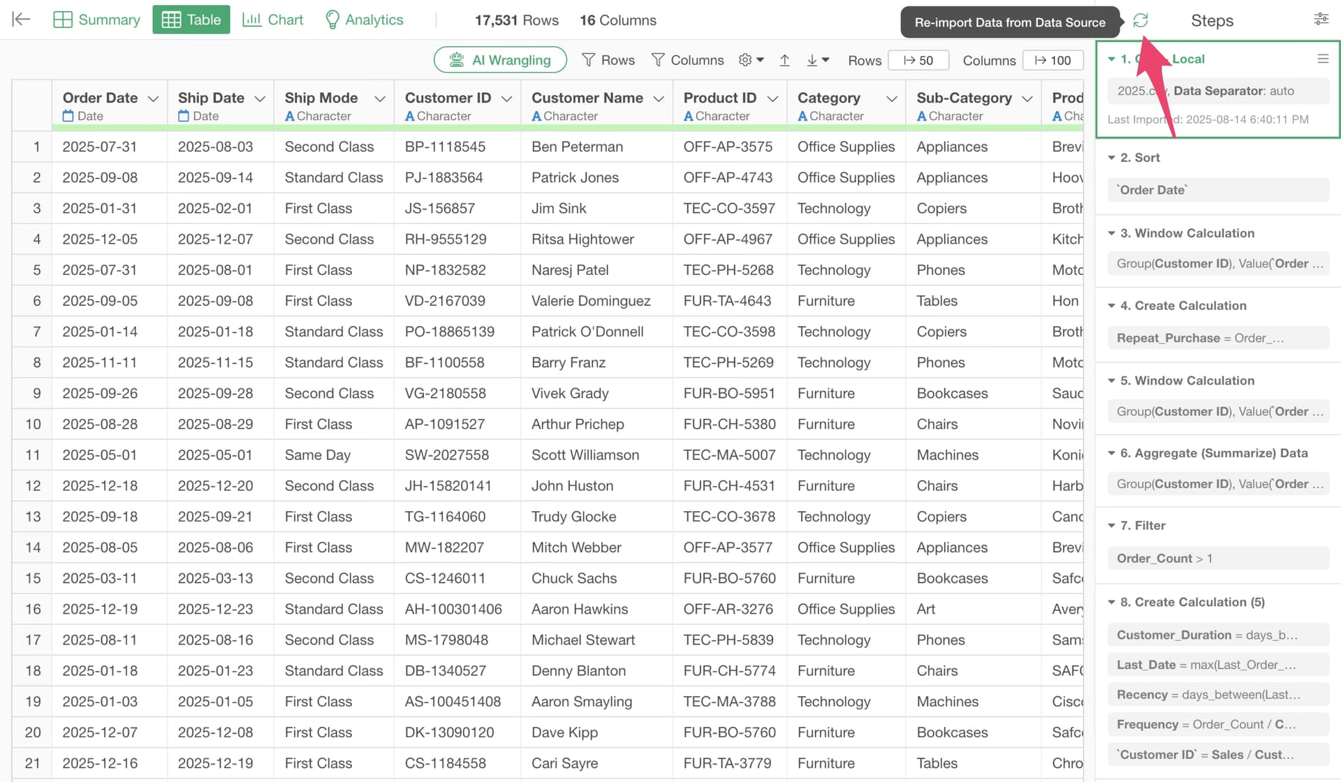 Specifically, click the “Re-import Data” button located at the top of the steps in the data frame you wish to update.