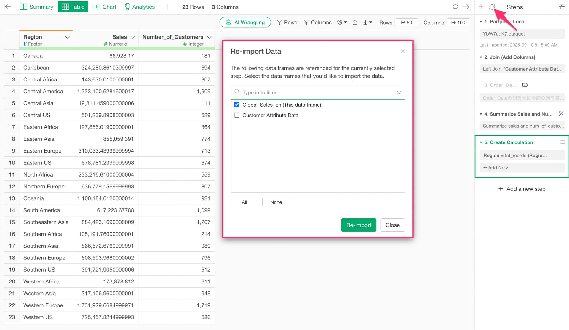 In Exploratory version 13.6, a new feature has been added that allows you to select and re-import only the necessary data sources from data frames that combine multiple data frames through joins, merges, or other operations.