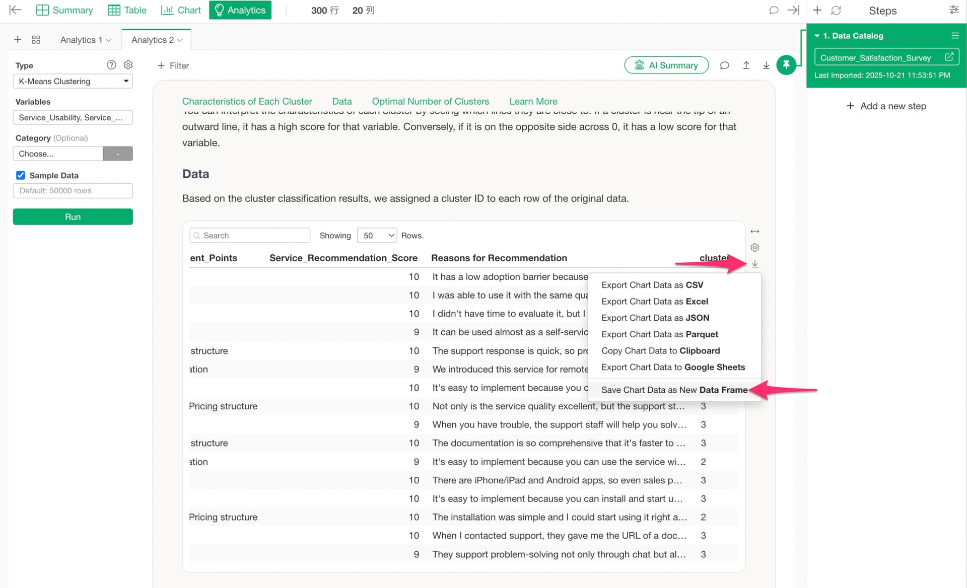If you want to save data executed in the Analytics View as a dataframe, you can do so by selecting “Save as Dataframe” from the export button of each chart as shown below.