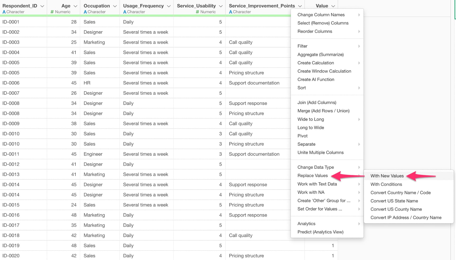 As a value replacement method, select “Replace Values” > “With New Value” from the column header menu.