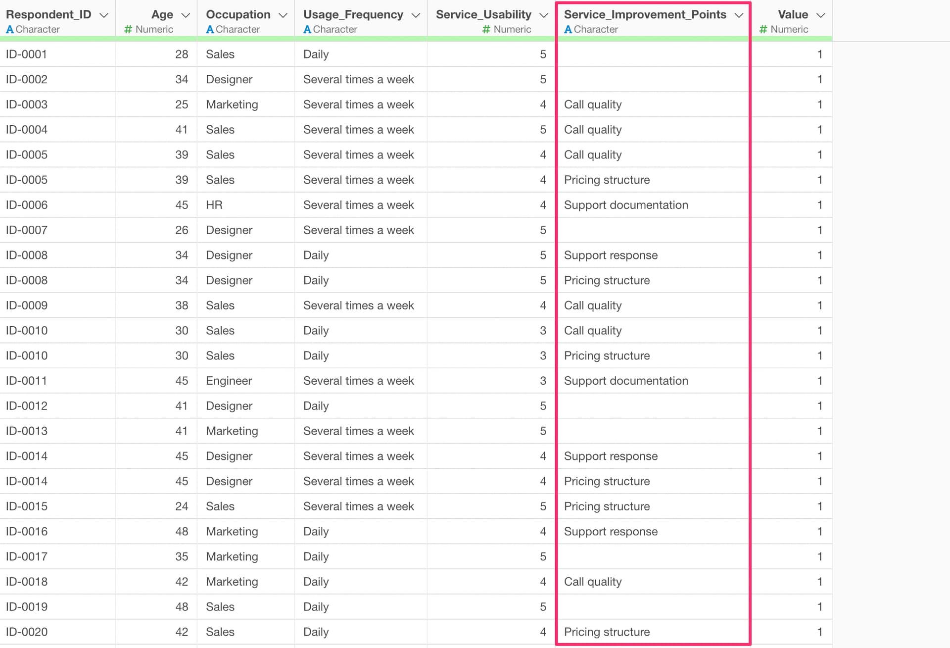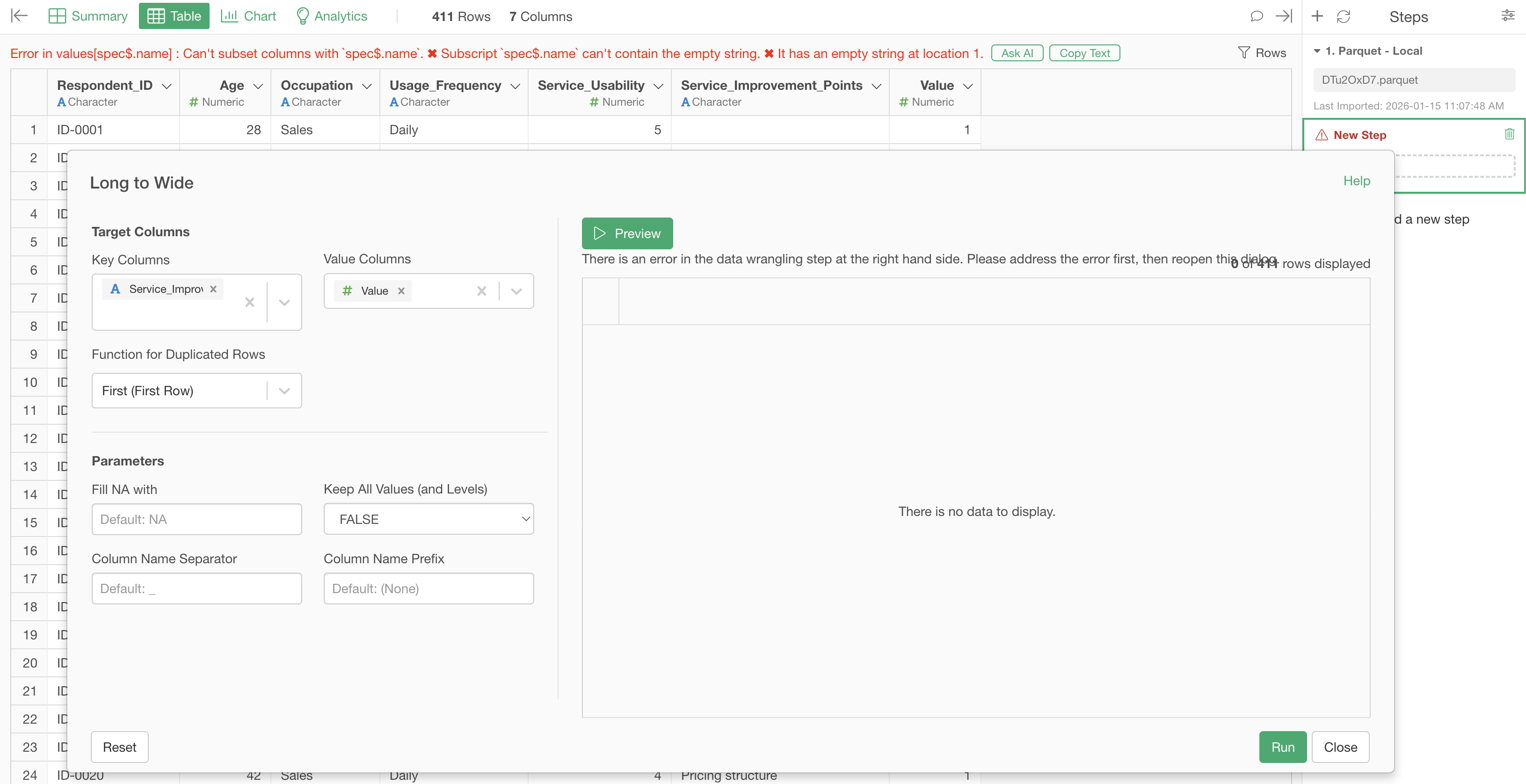 Therefore, please either convert empty strings to missing values in the key columns beforehand, or replace them with other values before attempting the wide format conversion.