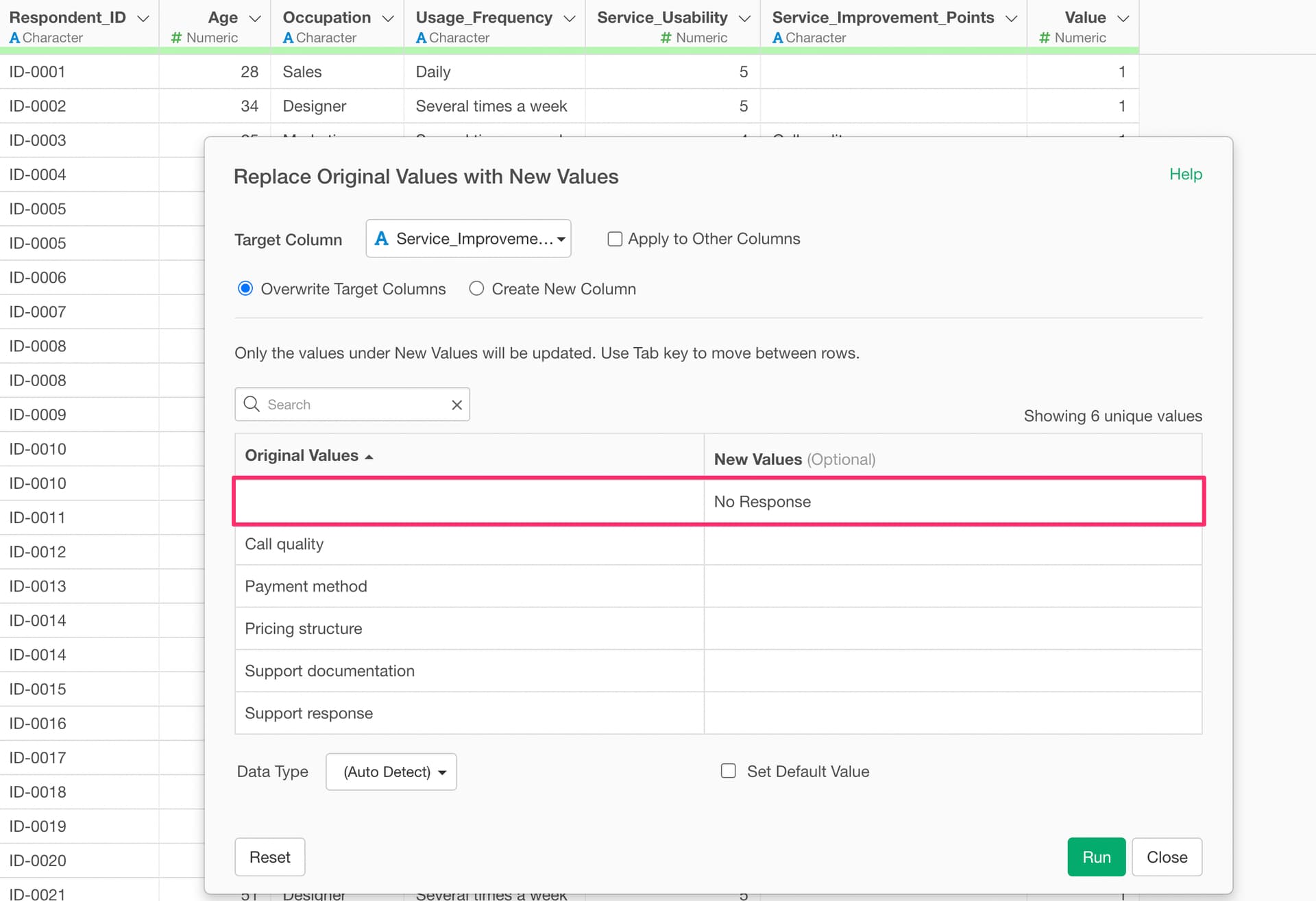 The Replace Values dialog will appear, allowing you to specify a new value for empty strings.