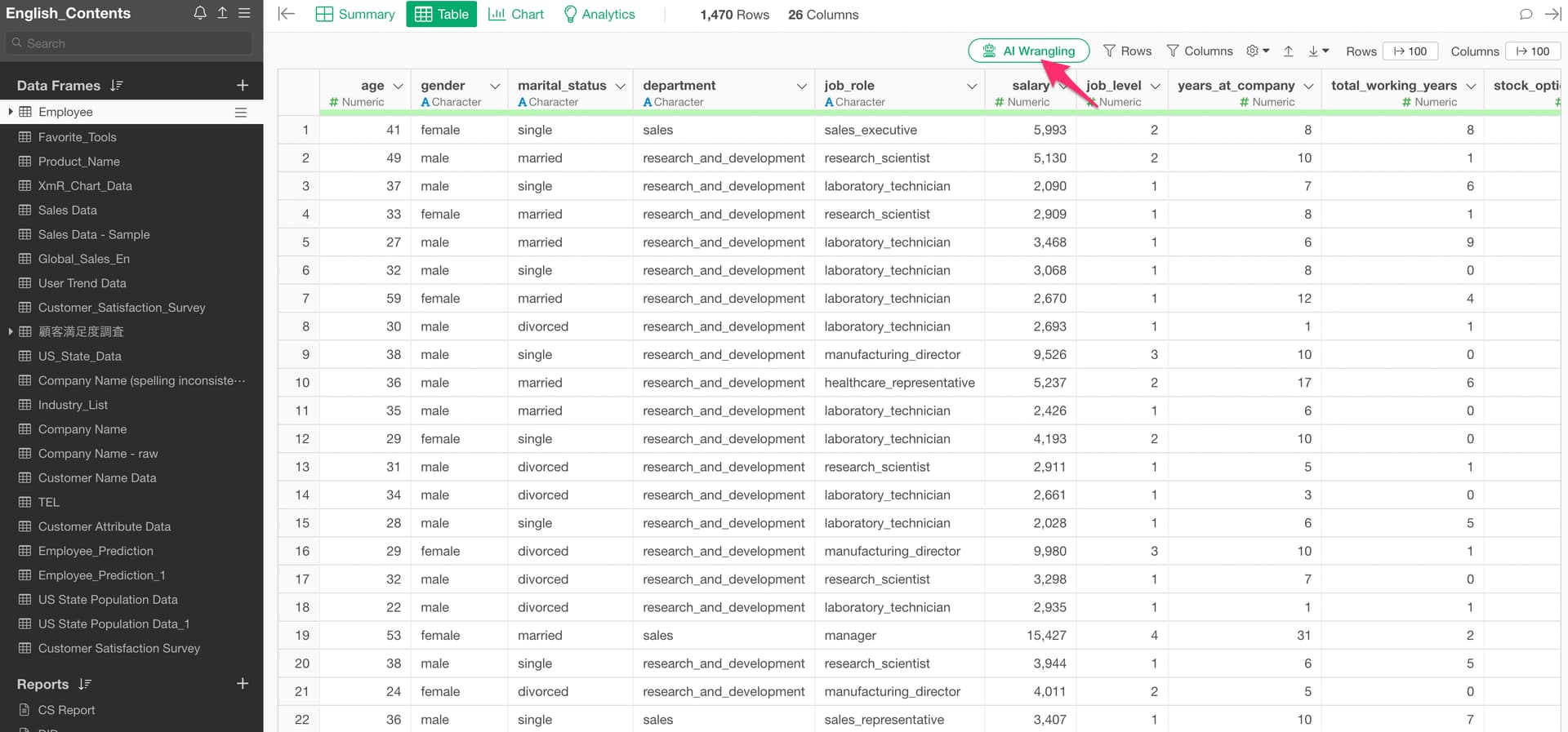 If the AI Wrangling (AI Prompt) button doesn’t appear, it’s possible that your project was opened without Exploratory Desktop being connected to the network.