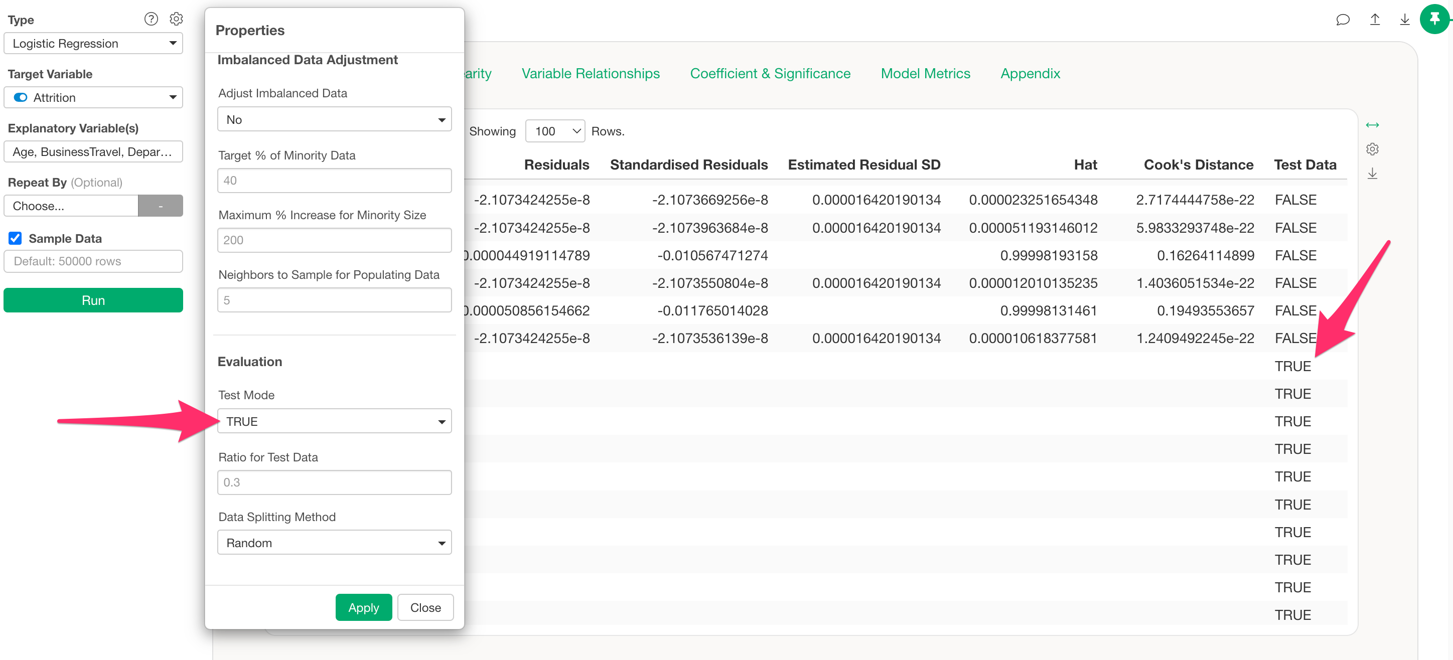 However, if you enable Test Mode in the Analytics properties, the data is split into training and test sets. In this case, rows assigned to the test set will show TRUE.