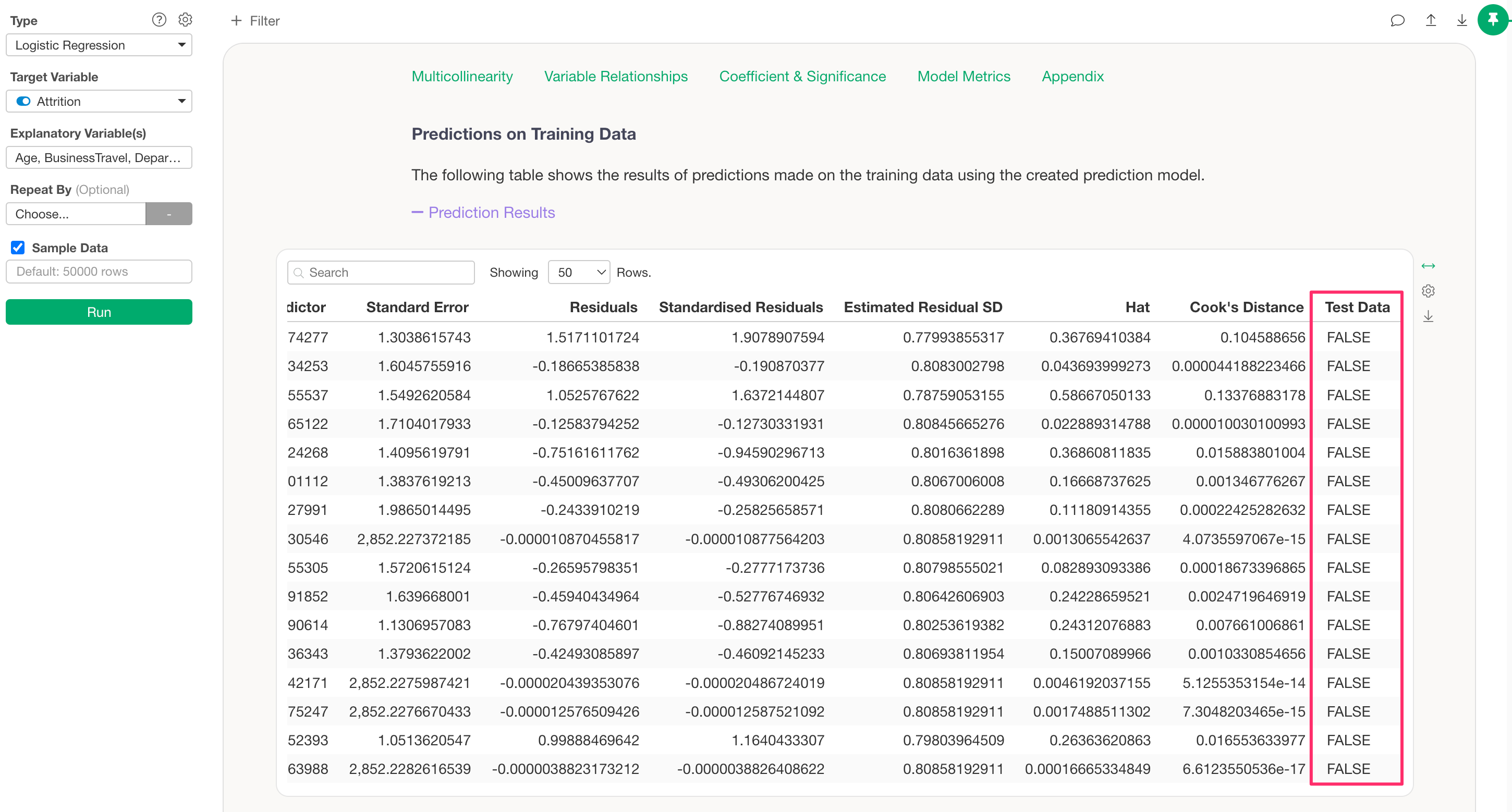 When building statistical or machine learning prediction models—such as Linear Regression, Logistic Regression, or Random Forest—within the Analytics view, the “Test Data” column in the Predictions on Training Data section indicates whether a specific row is designated as test data.