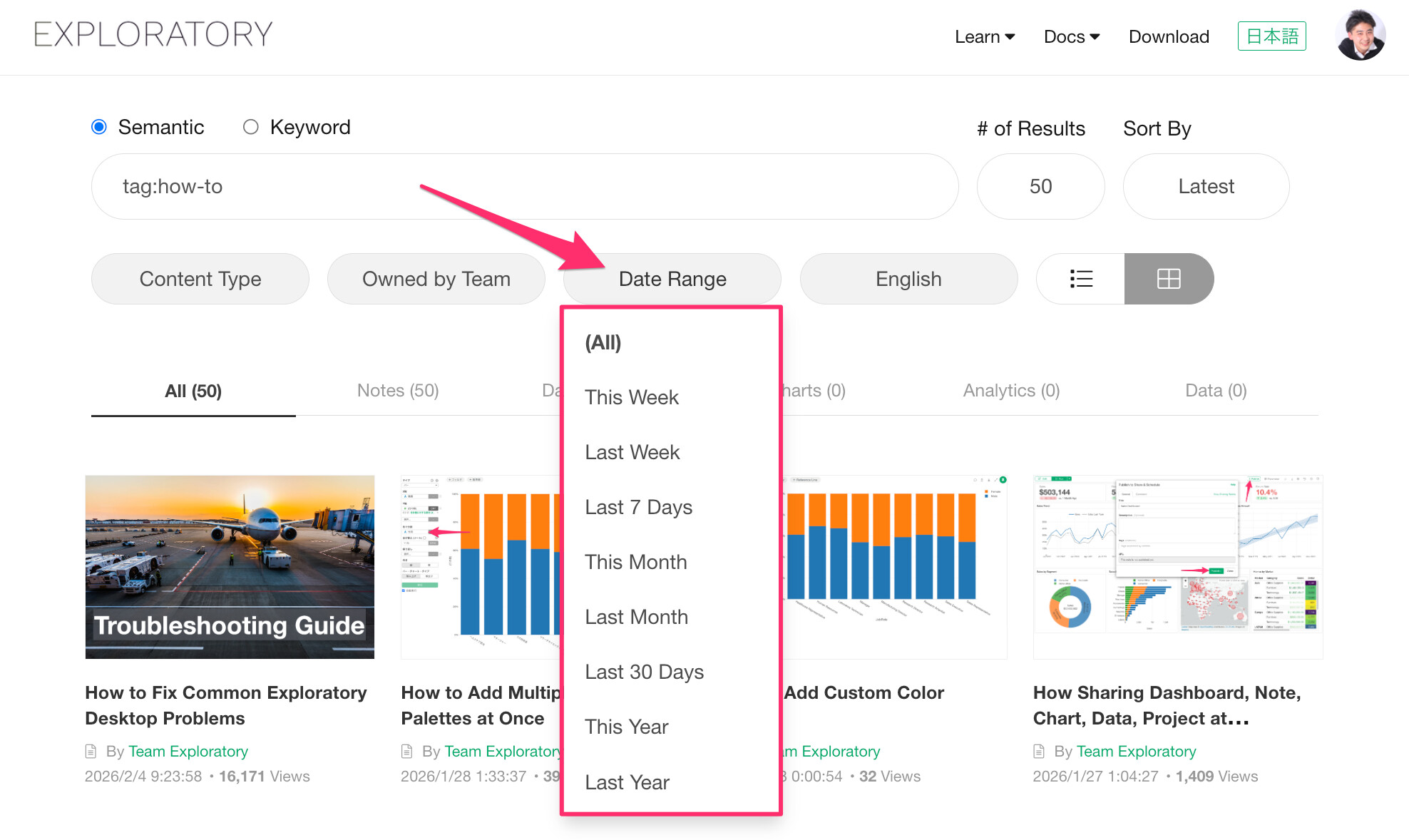 When a date range filter is specified on the content page, it functions as a filter for content that was viewed at least once within the specified date range.