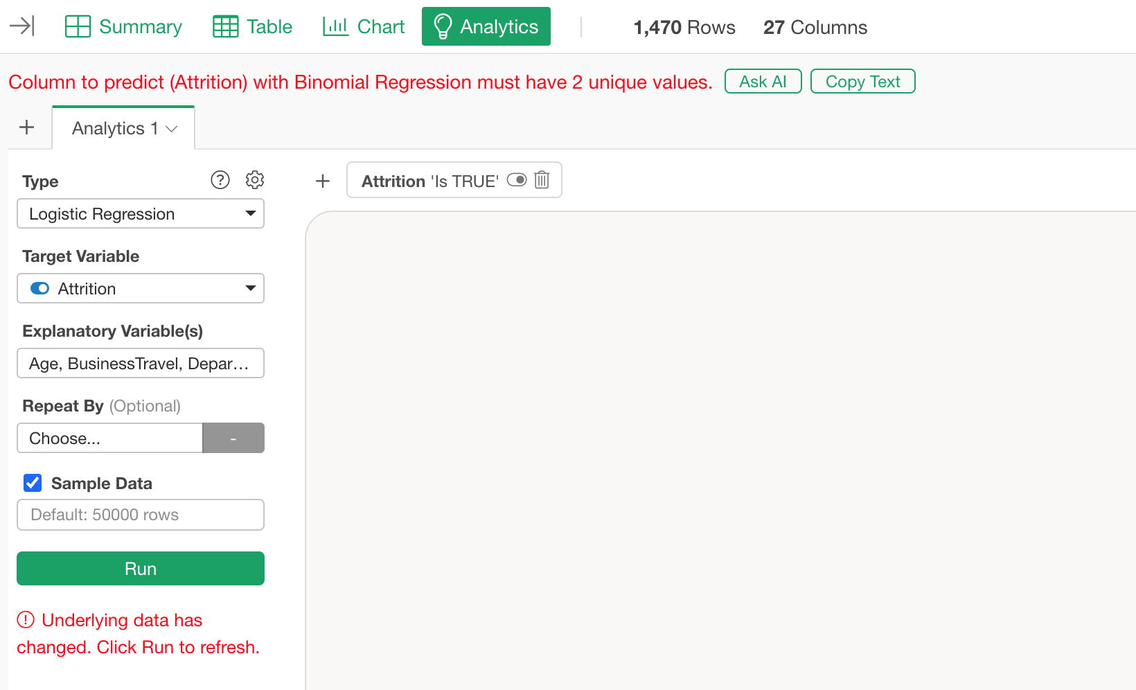 When running a “GLM - Binomial Distribution” or “Logistic Regression” model, you may encounter the following error: